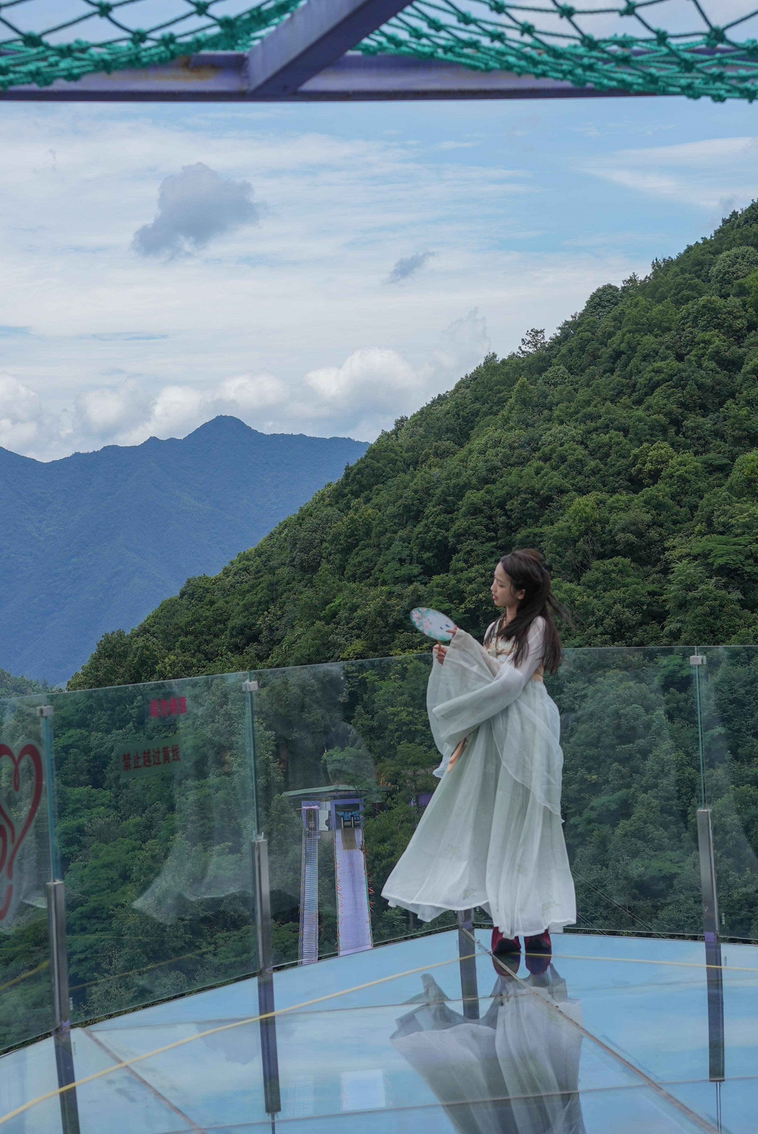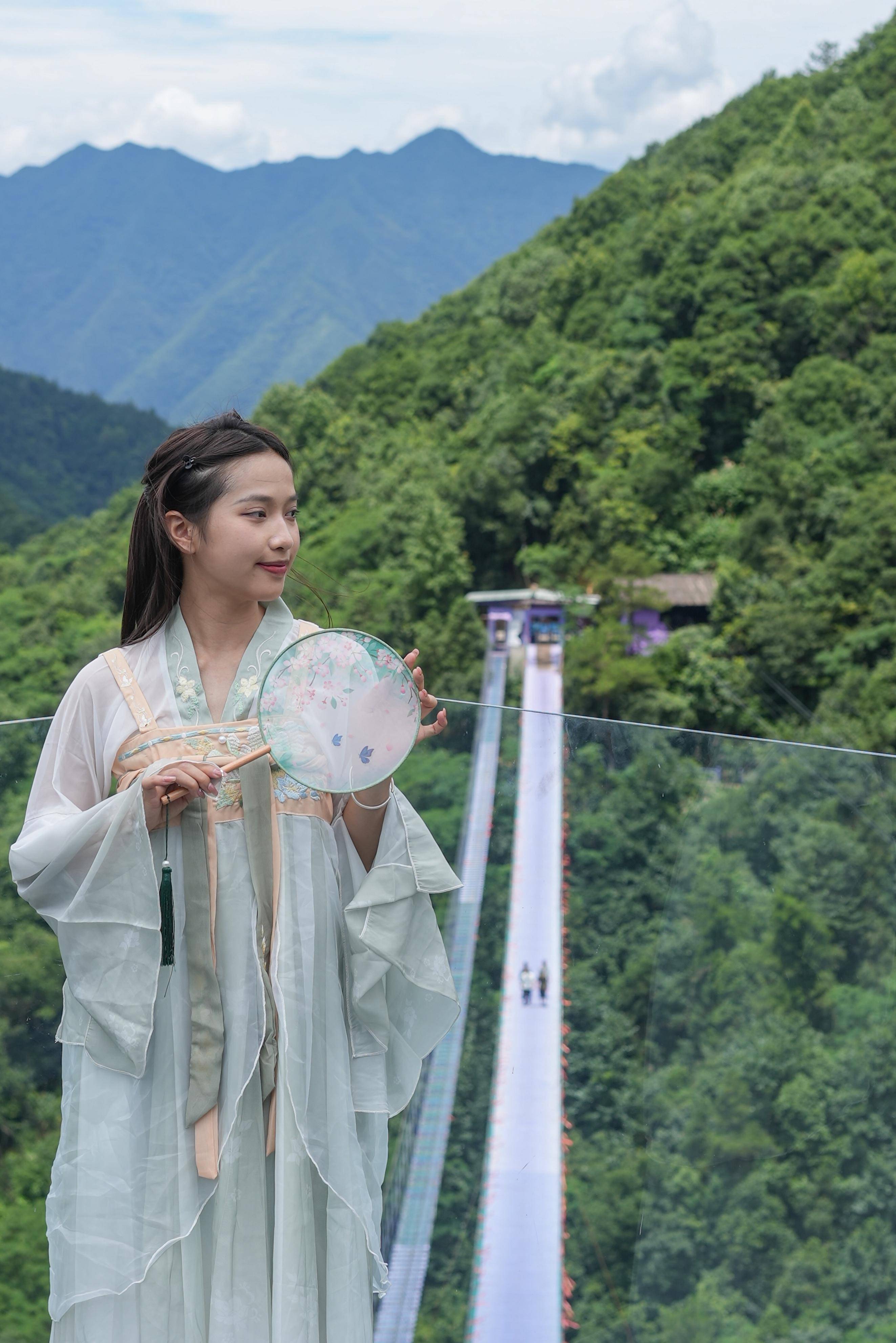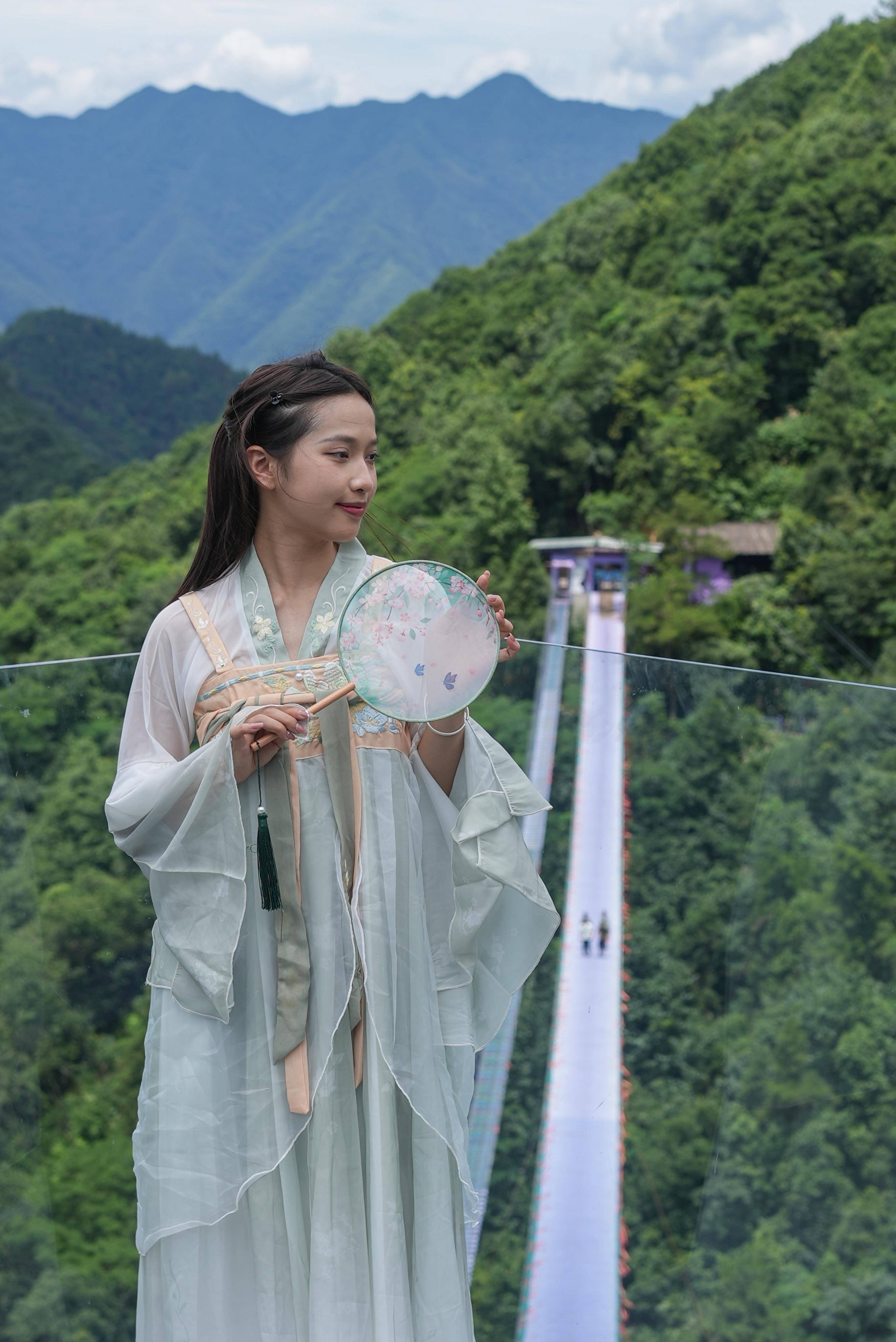 名为紫金花悬崖眺台的景点,也被称为天子地的天空之境。这是全球最大的双层玻璃观景台之一。从空中俯瞰,它就像一朵巨大而透明的水晶花,在山野间绽放。如果穿着汉服来到这里拍照,特别有一种仙境的感觉。