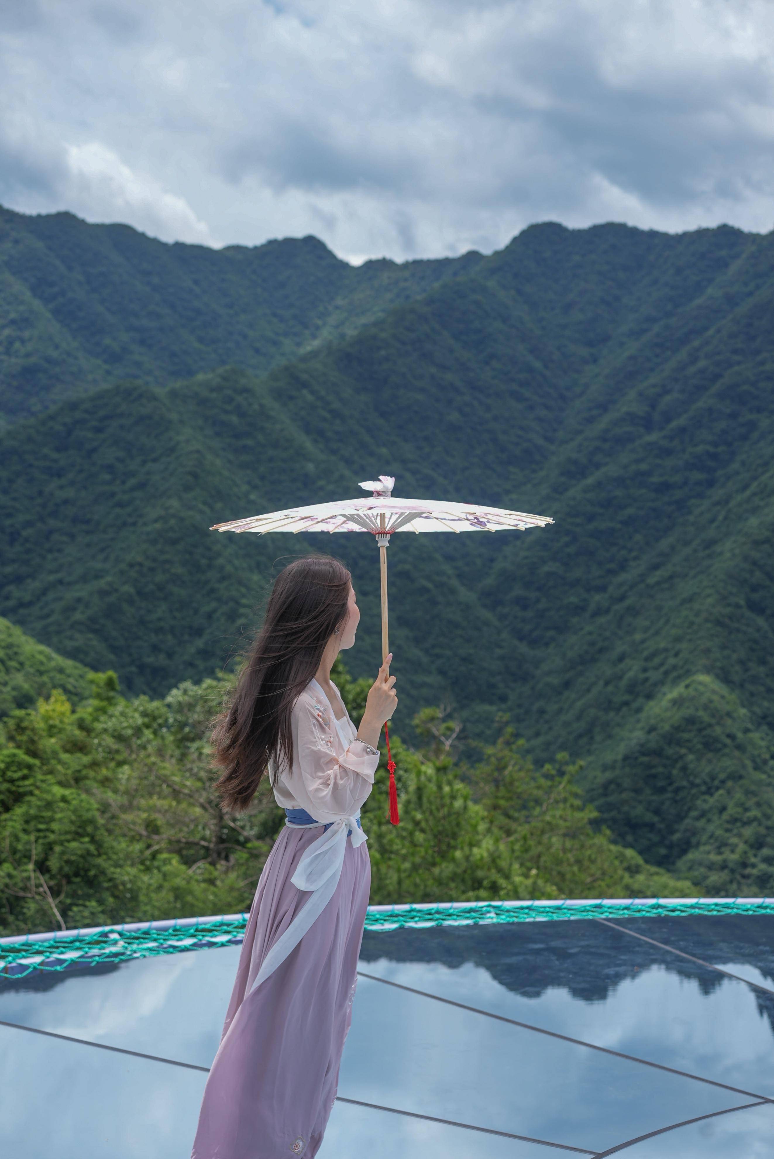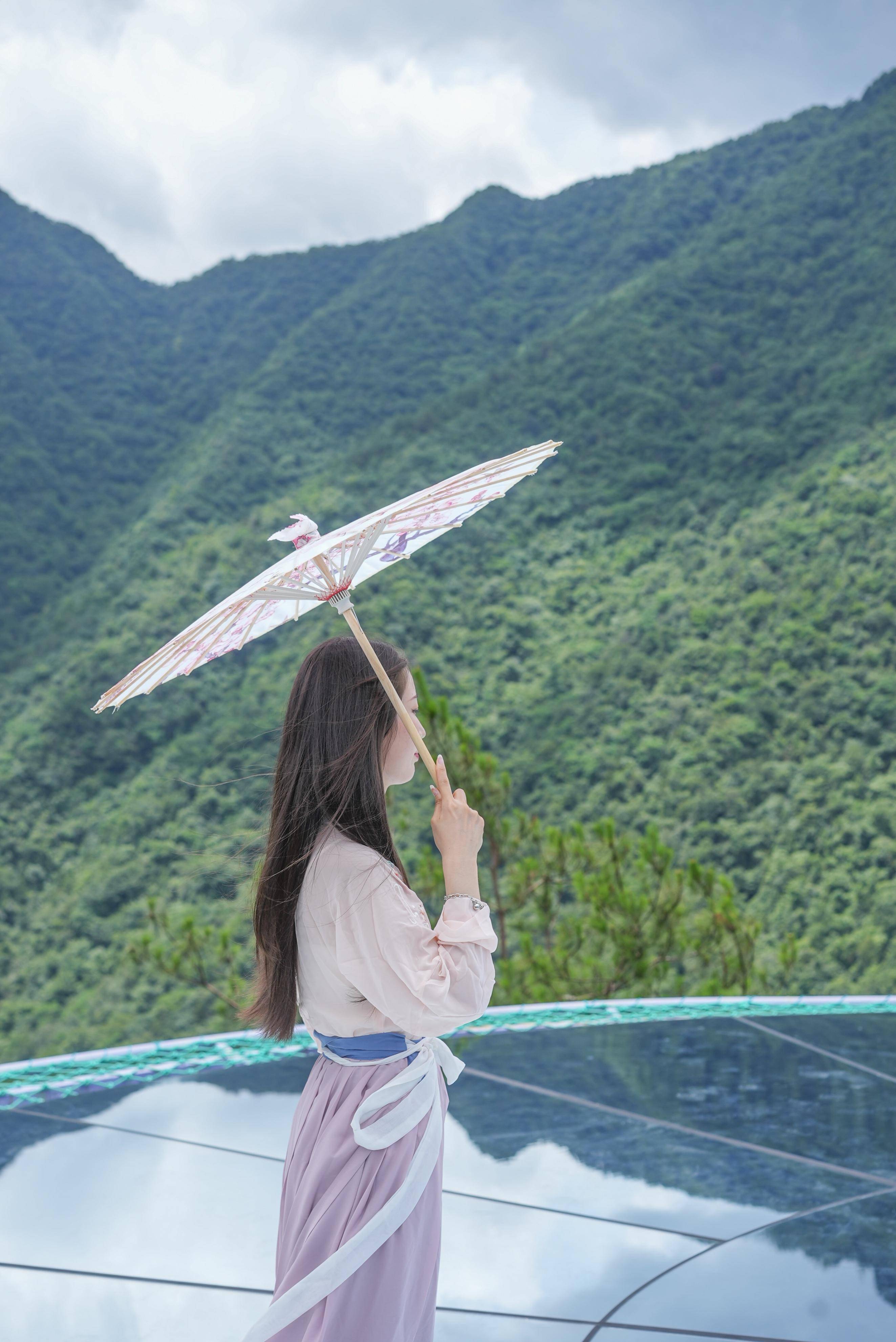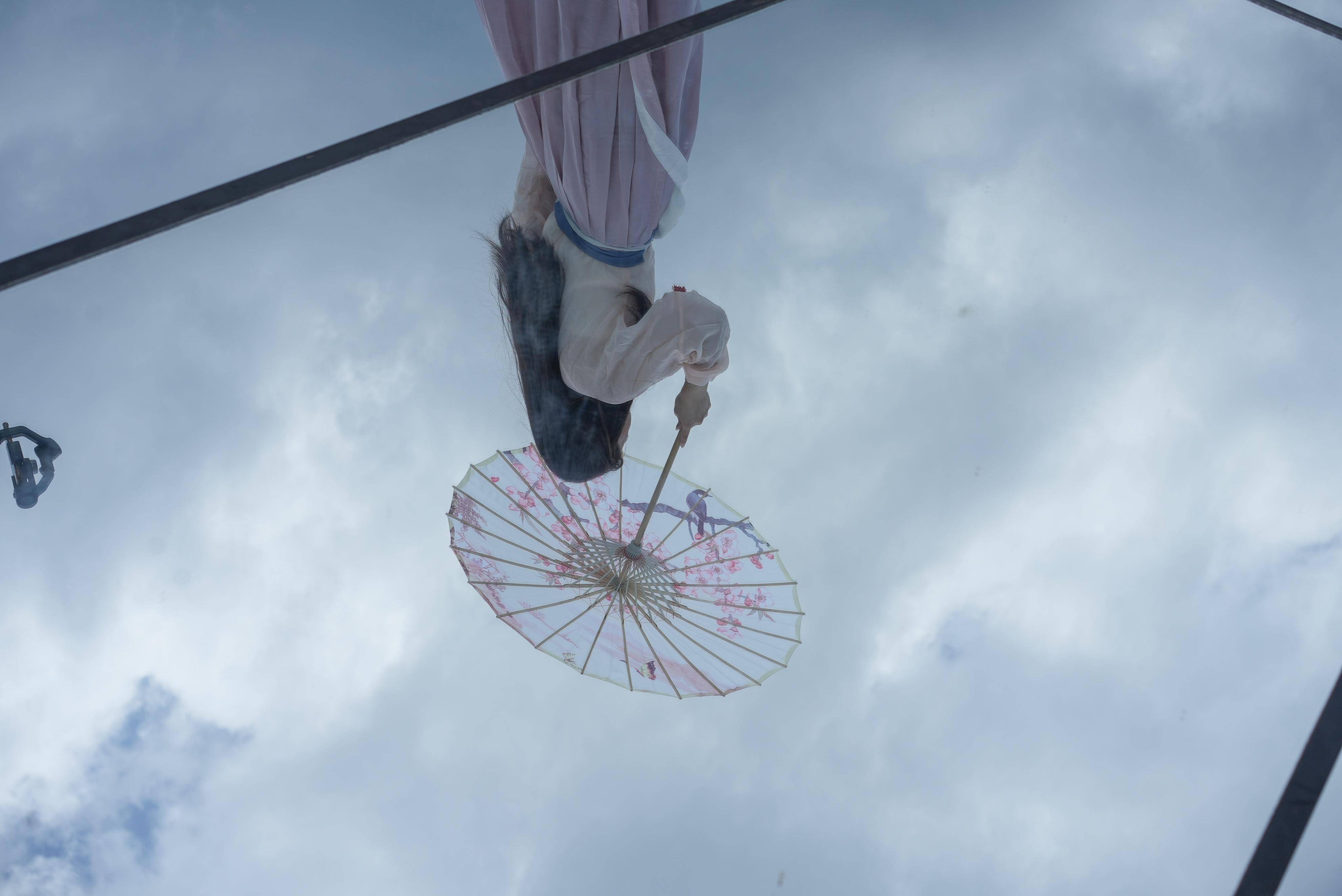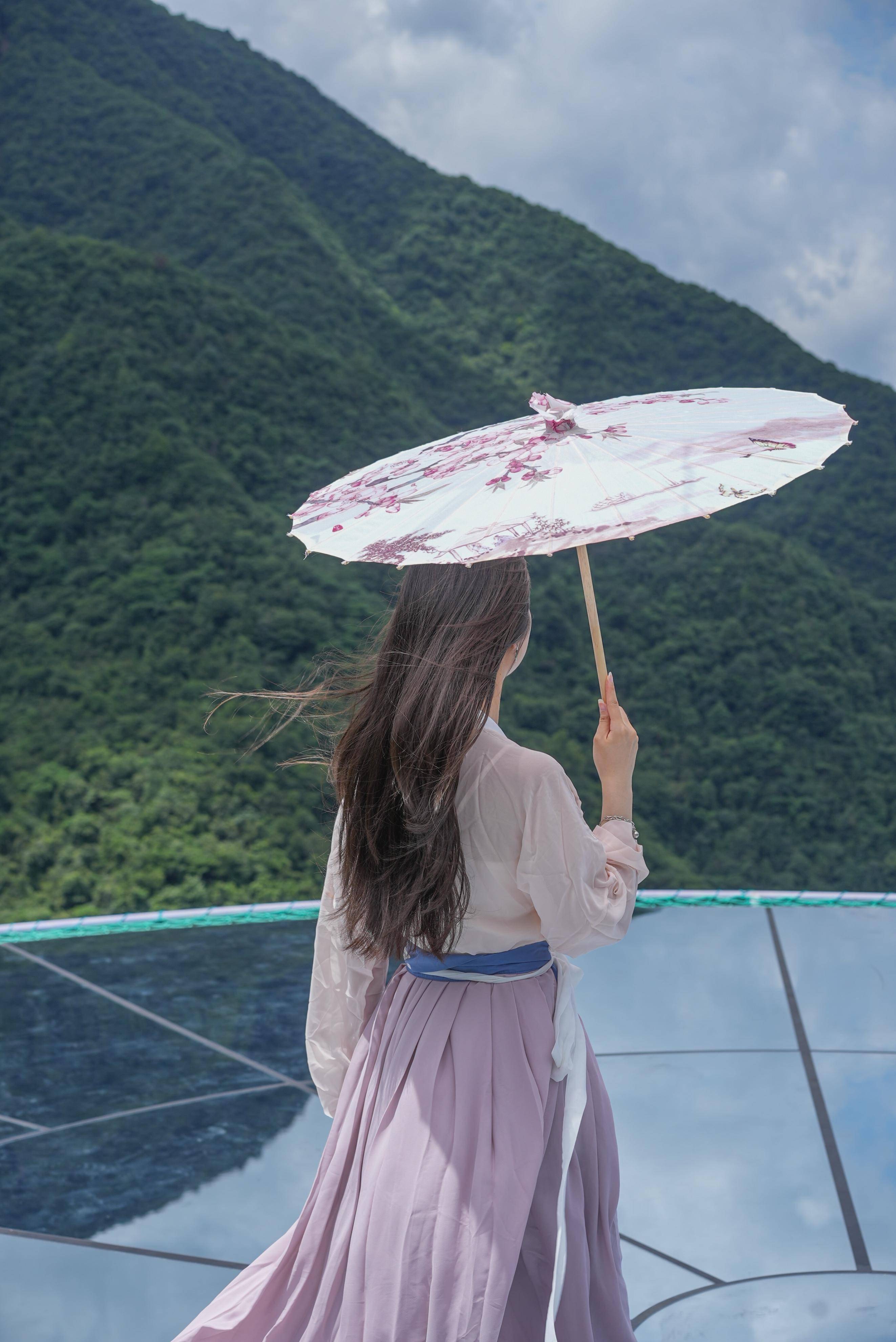 名为紫金花悬崖眺台的景点,也被称为天子地的天空之境。这是全球最大的双层玻璃观景台之一。从空中俯瞰,它就像一朵巨大而透明的水晶花,在山野间绽放。如果穿着汉服来到这里拍照,特别有一种仙境的感觉。