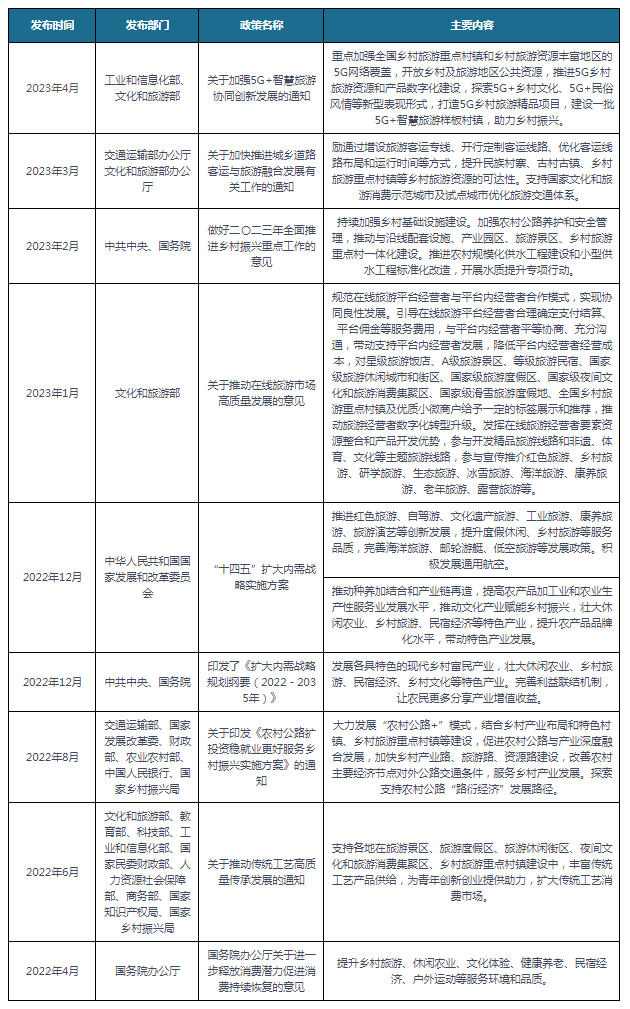 近些年来,为了促进乡村旅游行业的发展,我国陆续发布了许多政策,如2023年工业和信息化部、文化和旅游部发布的《关于加强5G+智慧旅游协同创新发展的通知》提出重点加强全国乡村旅游重点村镇和乡村旅游资源丰富地区的5G网络覆盖,开放乡村及旅游地区公共资源,推进5G乡村旅游资源和产品数字化建设,探索5G+乡村文化、5G+民俗风情等新型表现形式,打造5G乡村旅游精品项目,建设一批5G+智慧旅游样板村镇,助力乡村振兴。