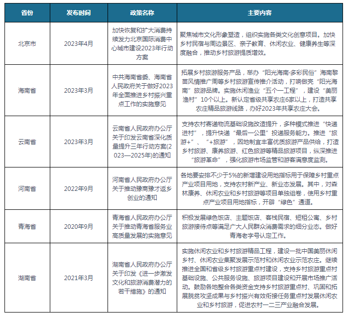 为了响应国家号召,各省市积极推动乡村旅游行业的发展,比如北京市商务局印发关于《加快恢复和扩大消费持续发力北京国际消费中心城市建设2023年行动方案》通知,聚焦城市文化形象塑造,组织实施各类文化创意项目。加快乡村民宿与周边景区、亲子教育、休闲农业、健康养生等深度融合,推动乡村旅游提质增效。