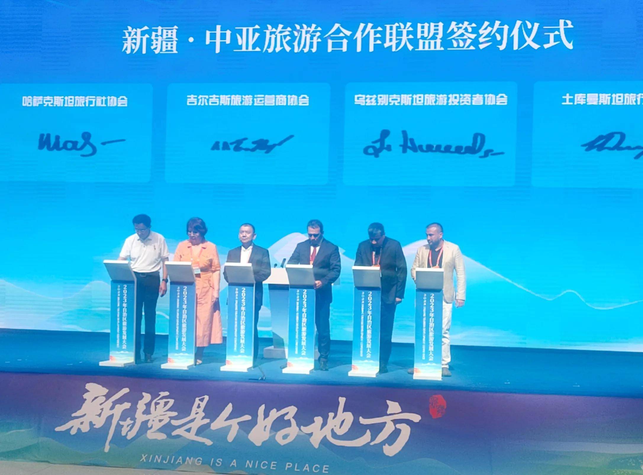 ▲新疆旅行社协会与中亚五国旅游行业协会及企业间协商合作组织签约成立我新疆·中亚旅游合作联盟。