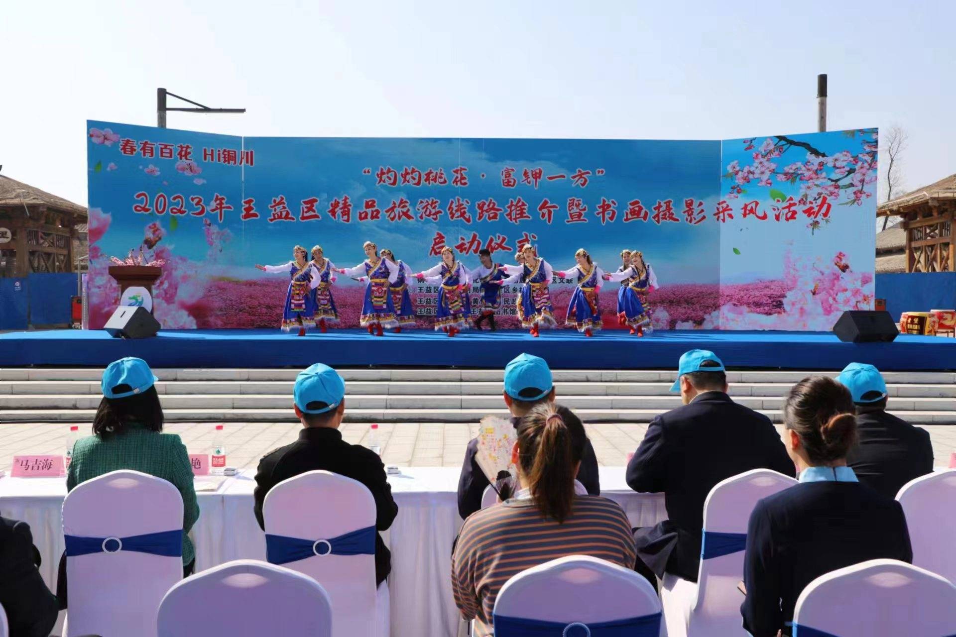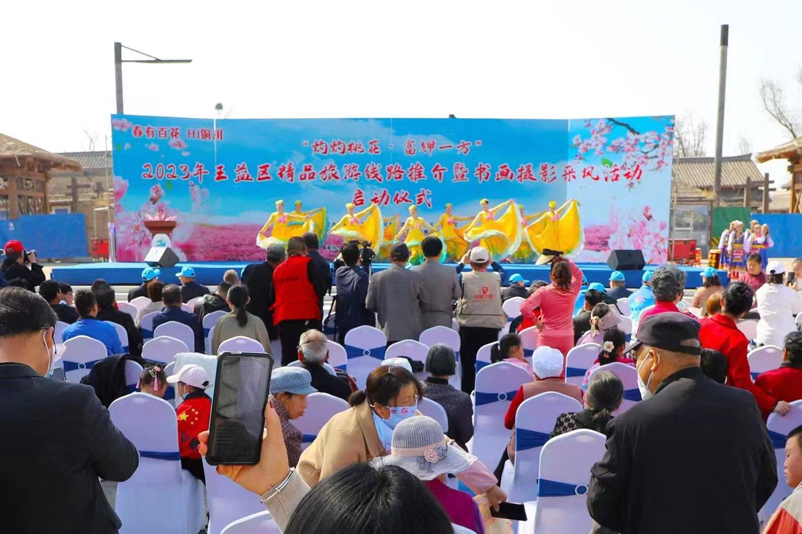 铜川市孟姜塬村是国家级“一村一品”示范村镇,也是远近闻名的“桃花村”,村落因孟姜女文化、孟姜红鲜桃而得名,环境优美。每到春日,这里的数千亩桃花竞相绽放,徜徉十里,明艳璀璨。每到这个时候,盛大的“桃花节”总会如期举行,精彩节目加动人美景,总是吸引着无数人的目光,赏桃花,游桃园,尝美食,拍美照,看演艺,都是不可错过的节日项目。今年的桃花节在4月1日当天开幕,开幕式上,“灼灼桃花·富钾一方”书画摄影采风活动同步开始,诸多书画名家绘制的“灼灼桃花”系列主题作品,将孟姜塬秦人村落景区正门的广场装扮的异常迷人,实景桃花加上艺术作品中的典雅花卉,瞬间将人带入仙侠世界般的浪漫桃花世界。