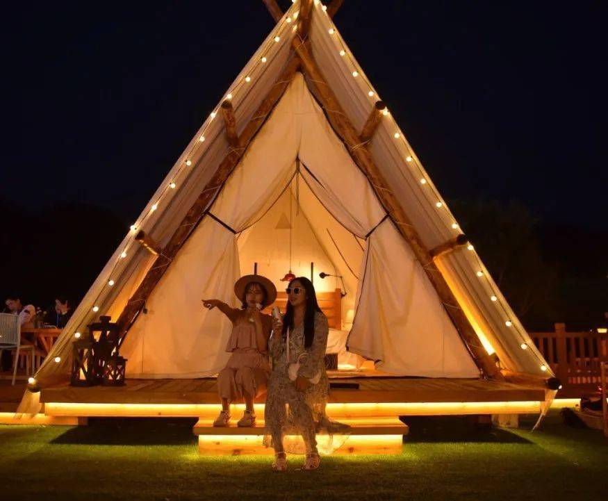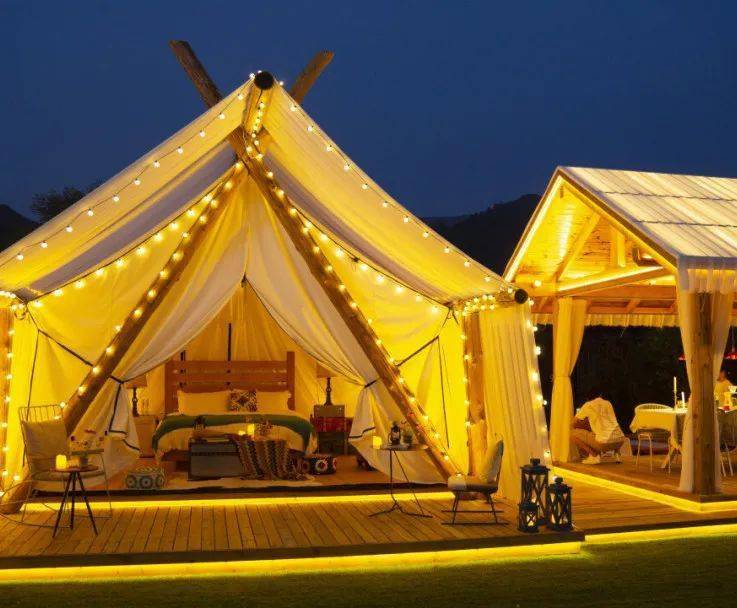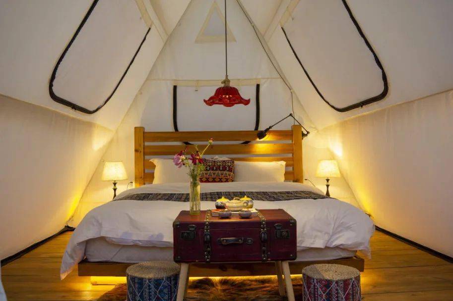 海拔400余米,群山环绕之下,一排排三角形的野奢帐篷有序地排列在草甸之上,走进帐篷,一派异域风情映入眼帘,养眼又养身。