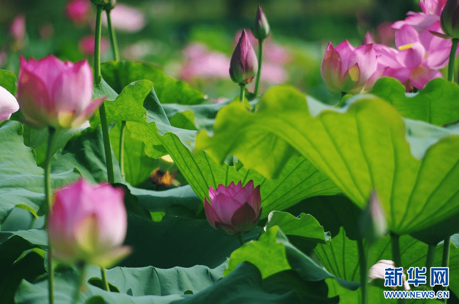 在抚州市广昌县,长桥乡香花湾景区的荷花竞相开放。新华网发 谢欣 摄