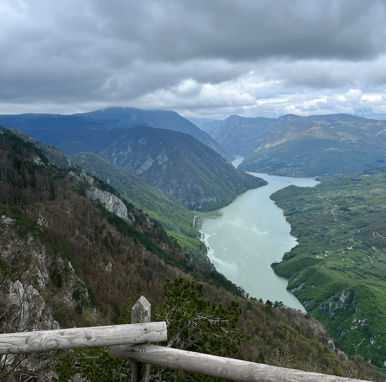 大约1小时后,抵达观景台,凭栏远眺,山脉连绵,层叠苍翠,俯瞰德里纳河峡谷以及佩鲁卡克湖,秀美壮观,对面的波黑近在咫尺。