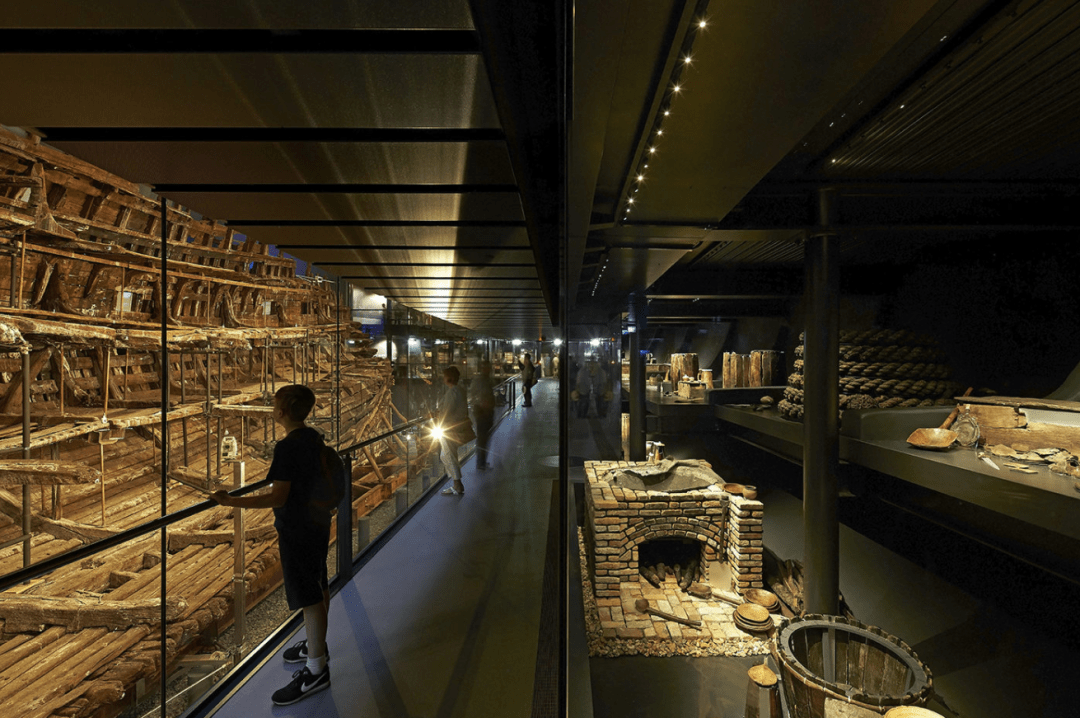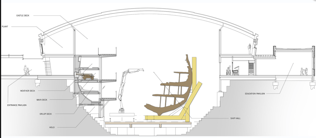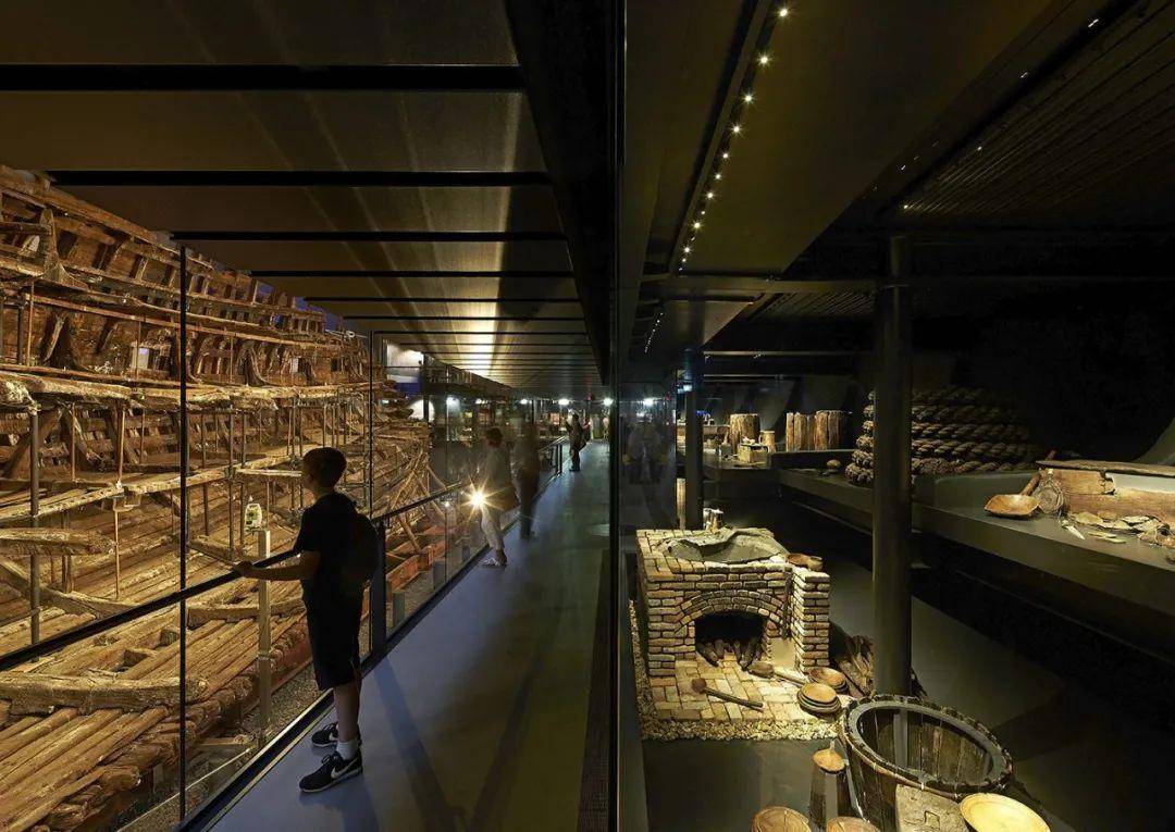 为了补充船体缺失的部分,设计师创造了一个虚拟的船体,其中按照船内原有的样子配备了枪、炮弹、备用品、储物箱和绳索等物品。博物馆分三层,游客可以在保存下来的右舷上行走,穿梭于真实和虚拟的船体之间,仿佛真的登上了“玛丽玫瑰号”,亲身感受船内的每一处材料和部件。尽端的展区由Land设计事务所设计,其布局更接近传统的博物馆,对历史画廊中的展品进行了详尽的说明。