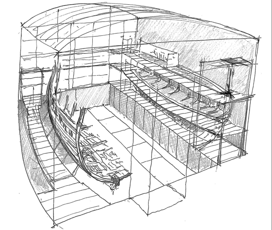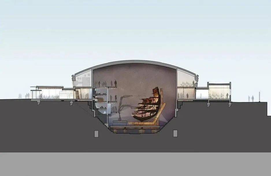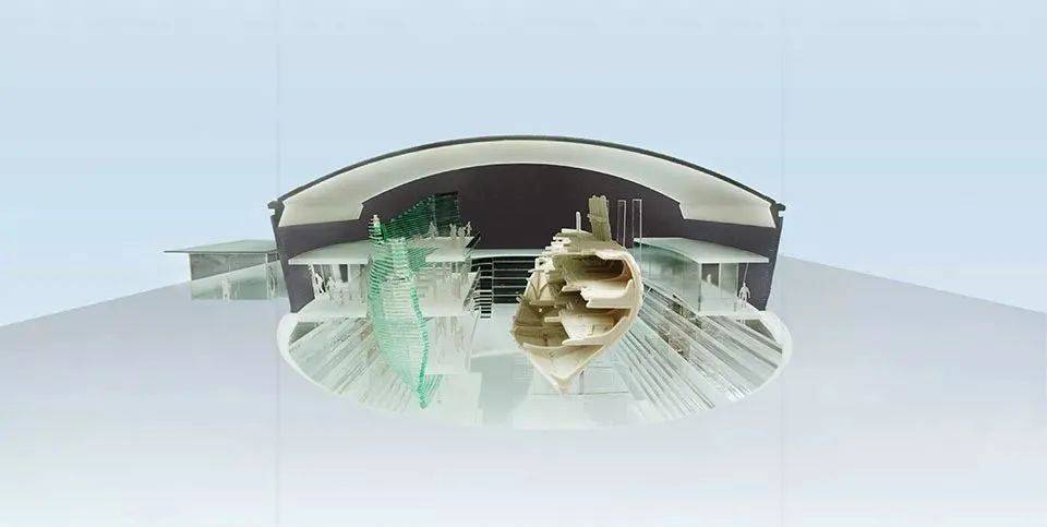 ▼剖透视图,虚拟船体和真实遗迹互为镜像