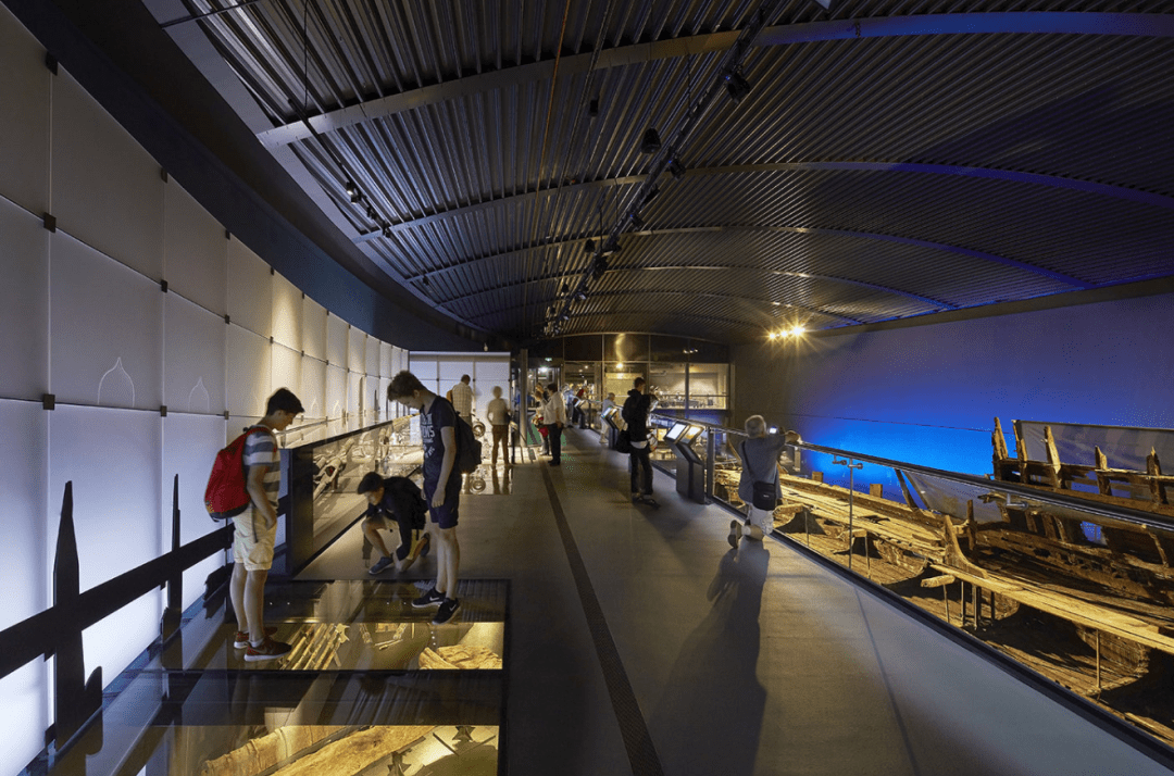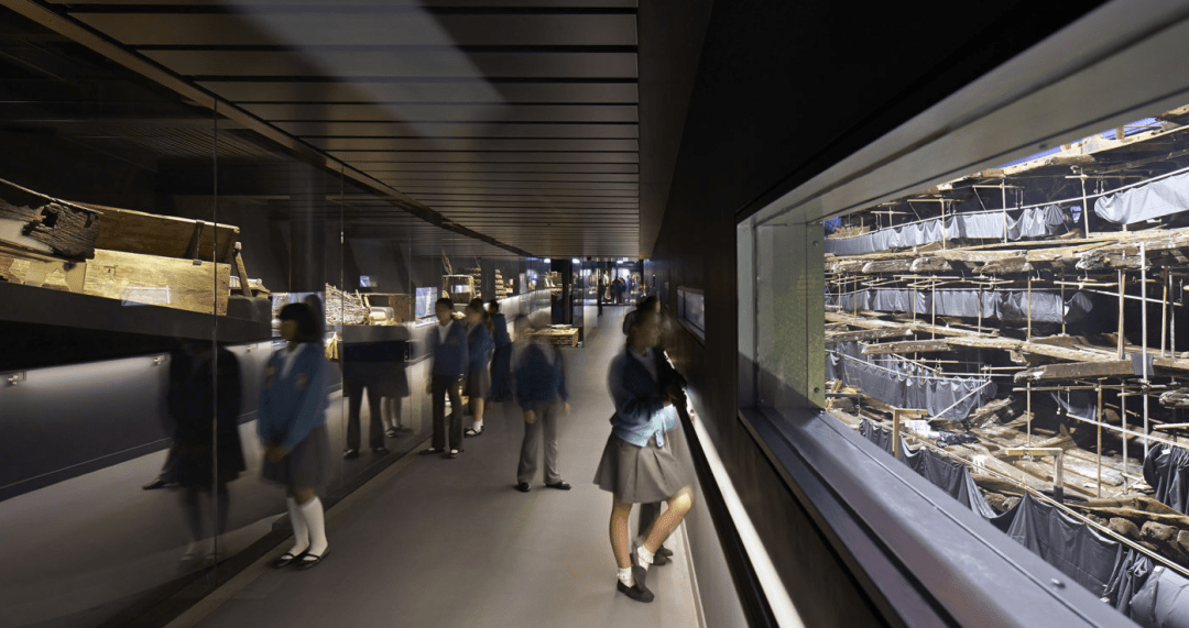 步道沿船身设置,从船尾一直延伸到船头,船舱内天花低矮,进一步强化了身临其境的感觉。设计特意不让日光射入展区,保持空间昏暗,只在展品上方和扶手下设置了灯光,让人们可以将注意力集中在展览上,重塑了舱内幽暗封闭的空间氛围。