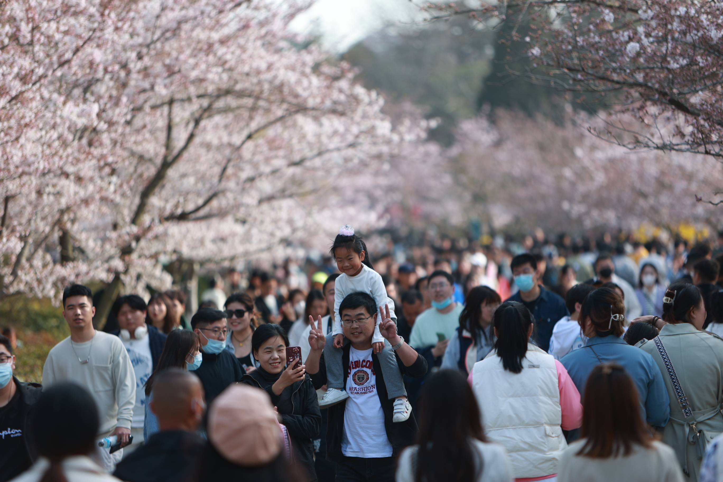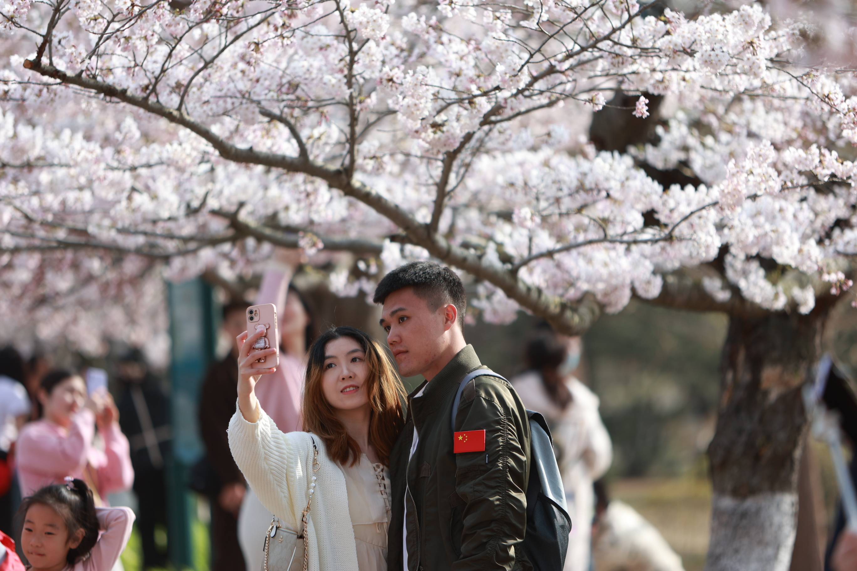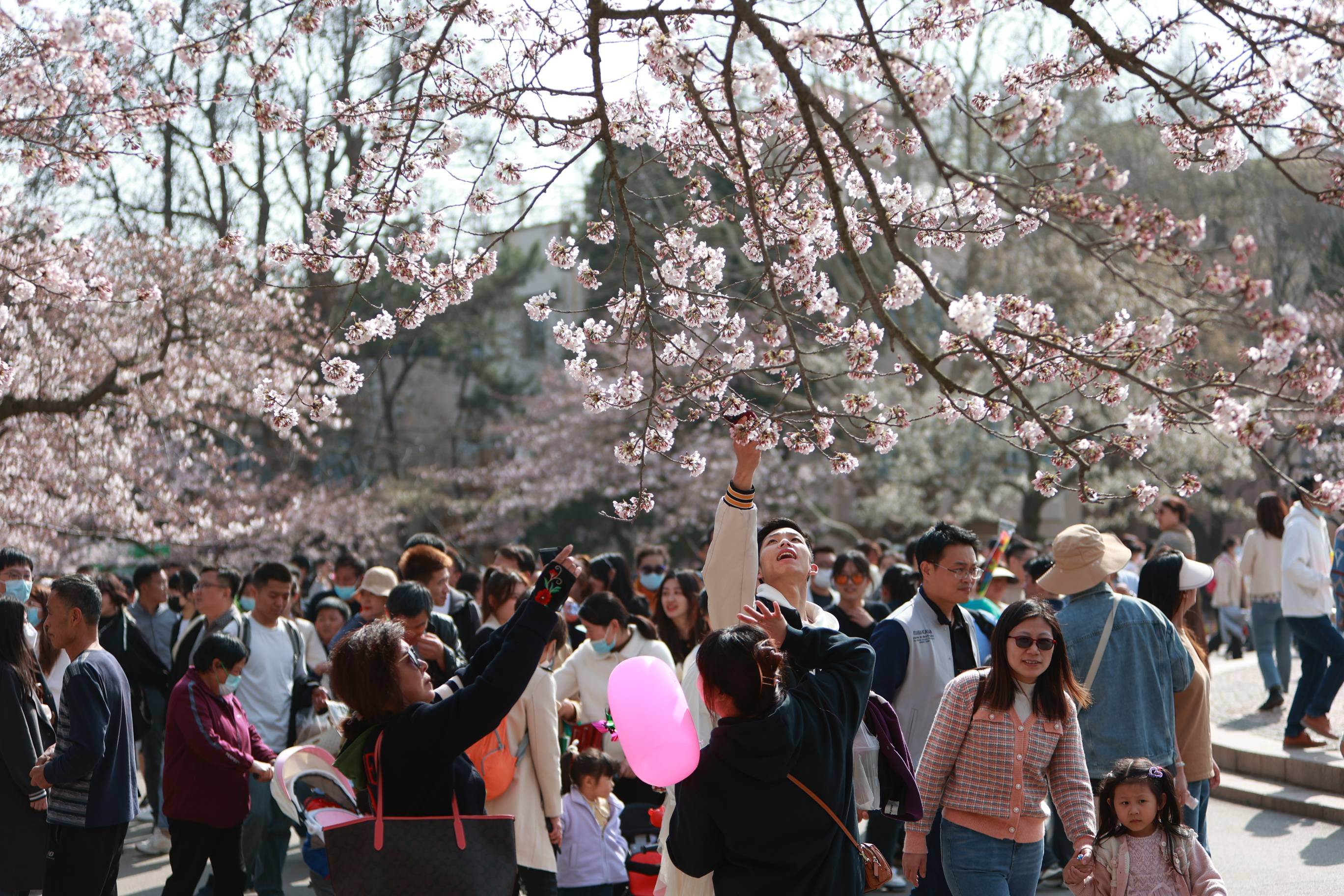 4月2日,山东青岛天气转暖,中山公园内的樱花终于迎来盛花期,数百株樱花树争相绽放。并且第三届樱花节也正式启动。另外,由于正值周末,当天吸引了数万名游客前来赏樱,以至于周边道路拥堵严重。