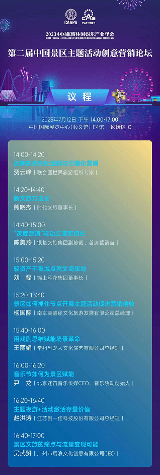作为2023中国旅游休闲娱乐产业年会的分论坛之一,中国景区主题活动创意营销论坛将于2023年7月12日在中国国际展览中心(顺义馆)举办。届时,联合国世界旅游组织专家贾云峰,时代文旅董事长熊晓杰,银基文旅集团副总裁,首席营销官陈美燕,锦上添花集团董事长刘磊,南京美睿途文化旅游发展有限公司总经理杨国标,常州恐龙人文化演艺有限公司总经理王丽娟,背景迷笛音乐传媒CEO,音乐跳动创始人尹龙,江苏创一佳科技股份有限公司总经理赵洪涛等行业大咖将欢聚一堂,共同探讨“创意营销如何助力中国景区主题活动”,欢迎届时关注!