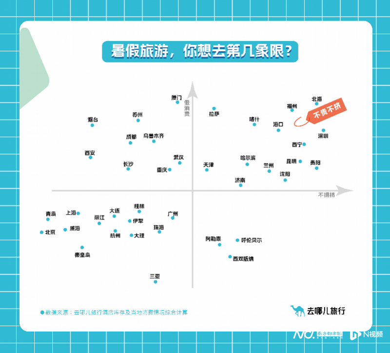 从目的地来看,暑期出游仍向大城市集中,北京、上海、成都、广州、重庆、西安、青岛、杭州、深圳、长沙是热门目的地。中小城市中,威海、湖州、伊犁、黔东南、淄博、万宁、延边、汕头脱颖而出。