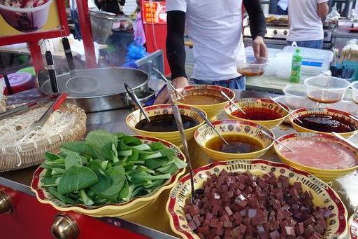 看看这摊子上的东西也是很丰富的。材料各种各样,有白色牛肚,黑色的牛肚、猪血等。
