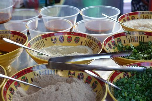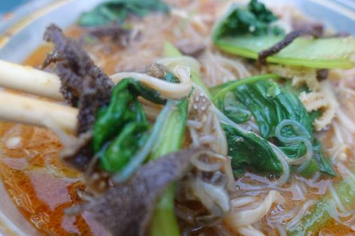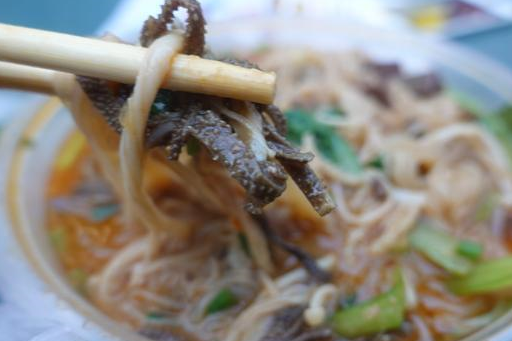 看看还不错吧?这摊子上的爆肚价格也是很实惠的,有10元一份的,15元一份的。付好款之后,老板把牛肚猪血之类的放到锅里涮一下,再放到煮好的粉丝上面,加上烫青菜,再加上各种佐料,这美味的老北京爆肚就做好了。