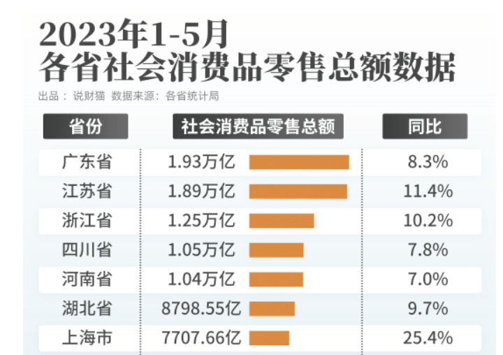 同时在已公布今年前5月消费数据的26个省/市/区中,广东超越江苏、浙江、四川、河南四个人口大省,成为最强消费省,社会消费品零售总额高达1.93万亿。