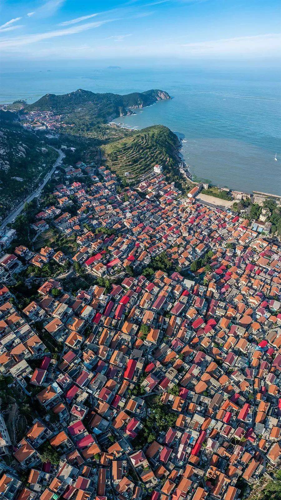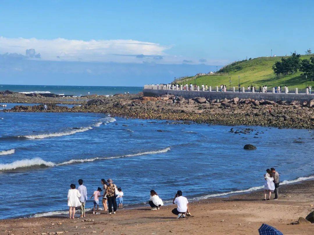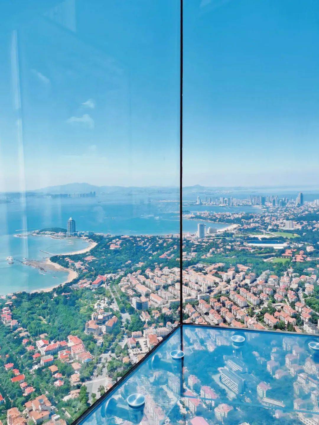 碧海、蓝天、白云、木栈道与城市建筑交织,