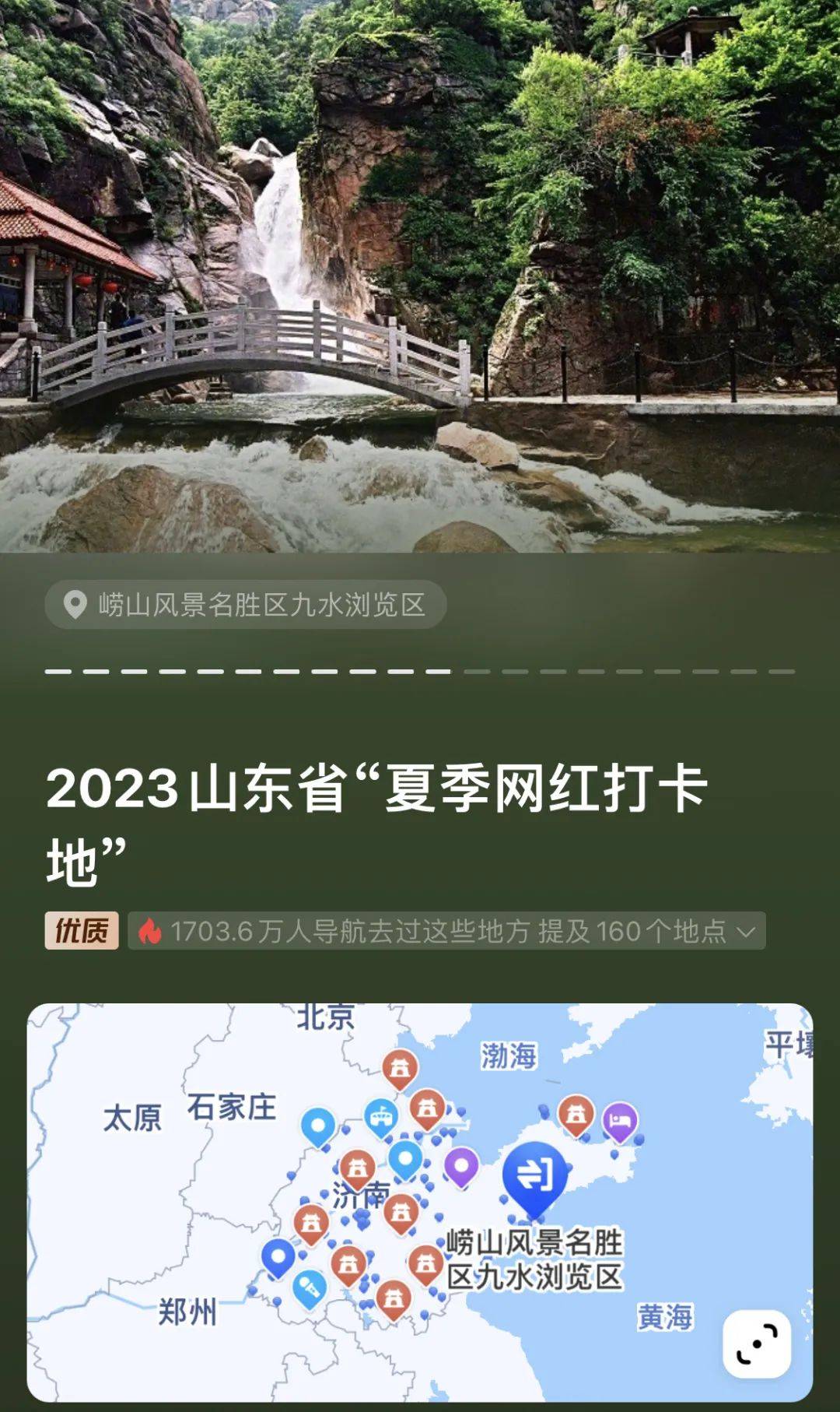 市民和游客可在高德地图、百度地图、腾讯地图三款APP中搜索“好客山东”进入“山东网红打卡地”专属页面,点击线路还可精准导航至相应网红打卡地。地图专属页面涵盖了山东夏季160个网红打卡地位置、简介、主要看点,还可查询交通线路、附近酒店等信息,吃住行游购娱一网打尽。