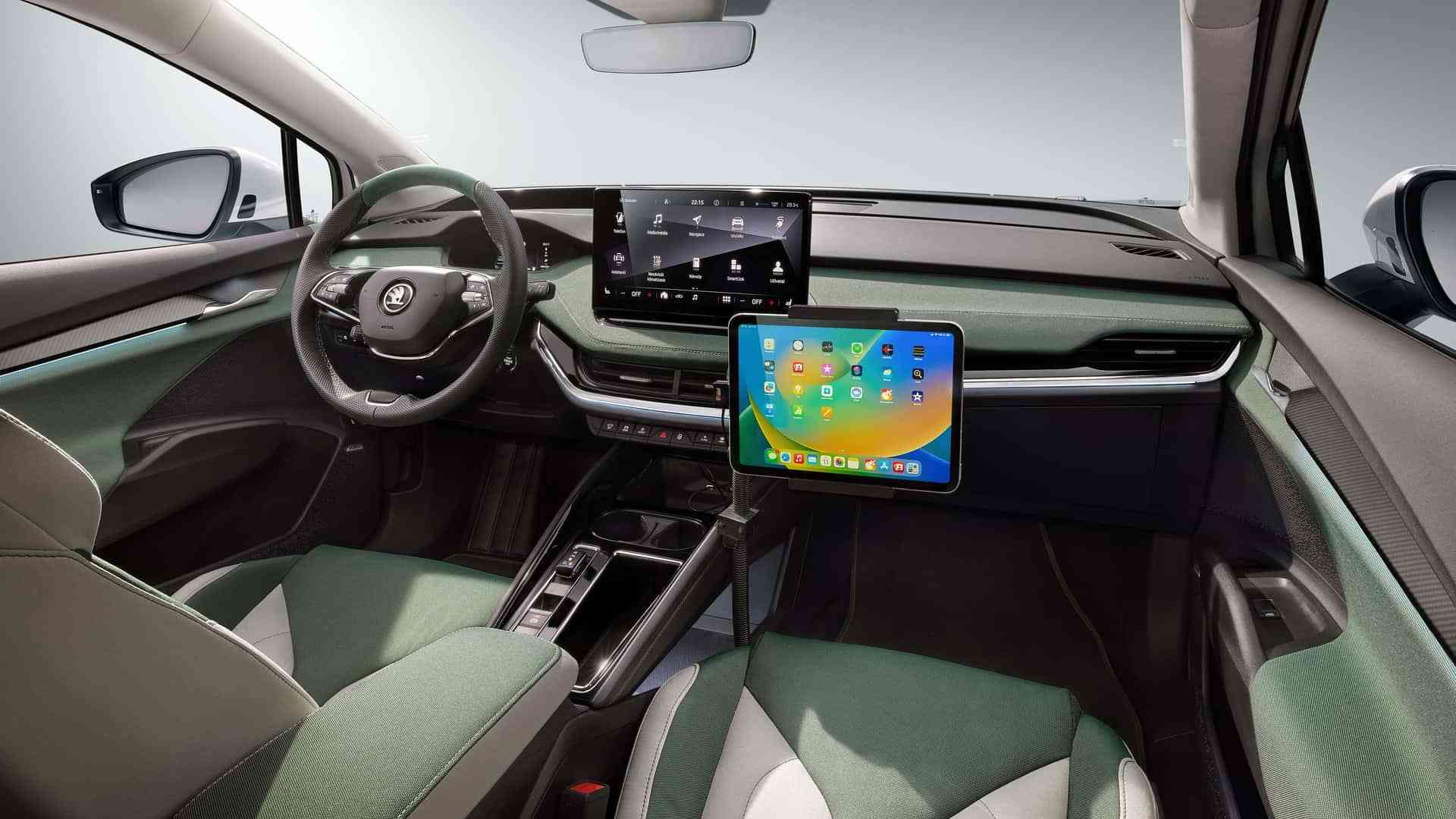 Roadiaq基于四驱版Enyaq 80x Sportline打造而来,并延续了原车的翡翠绿+月亮白双色车漆,以及21英寸密辐双色轮圈。尺寸上也与原车的车长、车宽保持一致,轴距略增至2770mm,离地间隙增至190mm。除此之外,背驮在车顶上的拓展空间,让整车高度达到了2050mm,这意味着内高随之增加了350mm。
