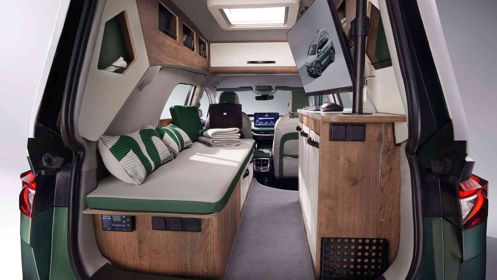 打开掀背式尾门,配合外置帐篷可以进一步拓展活动空间。不过由于布局的因素,左后门就被封死“废弃”掉了。至于配置,该车提供了无线音箱、太阳能淋浴器、浓缩咖啡机、救生包以及包含了拓展坞和无线键鼠组合的27英寸显示屏,配合随处可见的电源插座,随时随地都能移动办公。