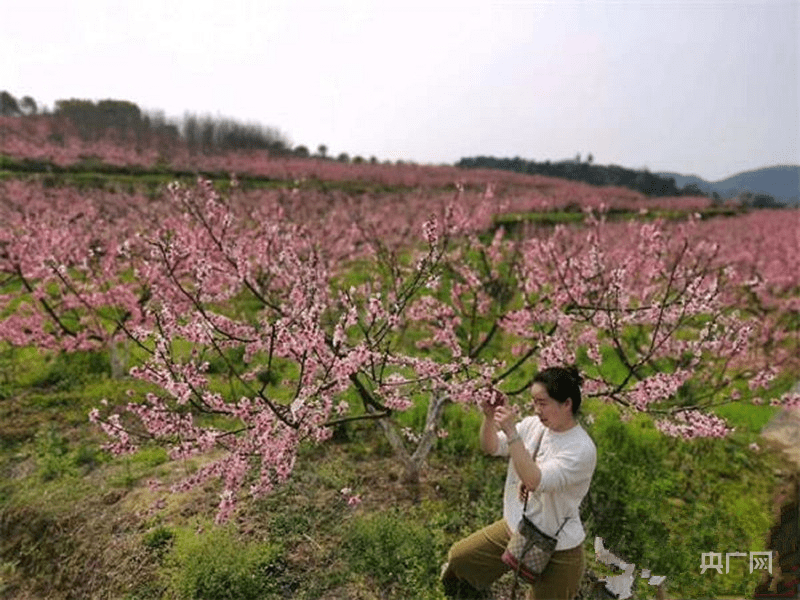 游人在刘什坝村黄桃基地拍摄美景(石颂军 摄)