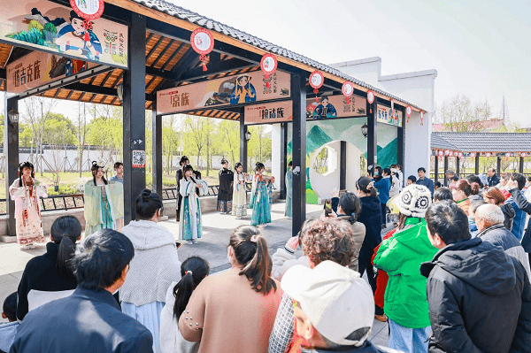 游客欣赏2023靖江旅游节·第十一届西来桃花节上的汉服秀(央广网发 盛义 摄)