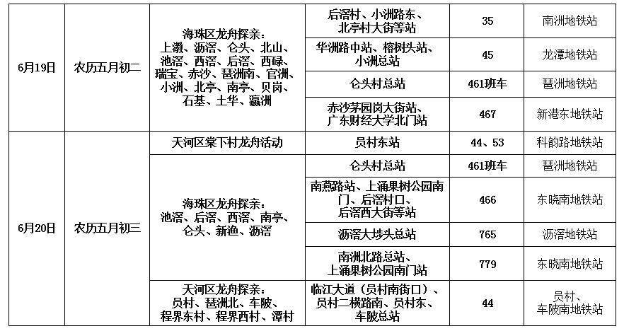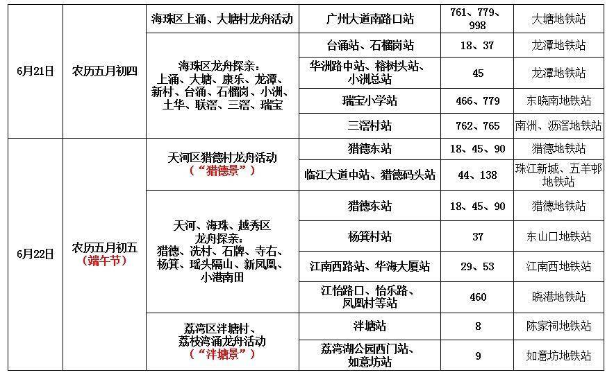 海珠区龙舟特色活动:公交35路、45路、461路、466路、467路、765路、779路等市民可乘坐广州东站至小洲的45路,在花洲路中心站、榕树头站、小洲码头下车,可观赏土花、小洲等地的龙舟特色活动;东晓南站至后滘西街之间乘坐地铁466号线,在南燕路、上冲国树公园南门、后滘村口、后滘西街等处下车,可观看赤脚、西脚、龙舟等特色活动后角等地。
