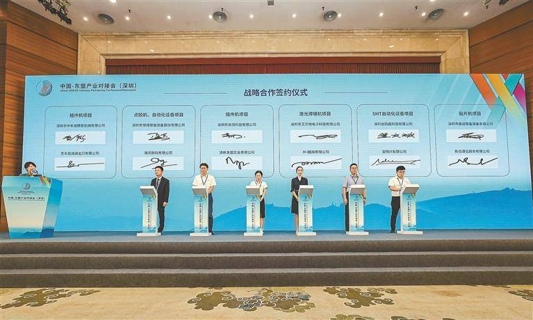 作为产业对接会的重头戏,来自柬埔寨、菲律宾、泰国、越南、新加坡等国的企业、机构代表与深圳等地的30余家新兴产业企业和机构代表,签署了20项战略合作框架协议,签约项目涉及商贸、物流、仓储、生物科技、机械制造、智能装备、信息通信等领域,意向合作金额超50亿元人民币。