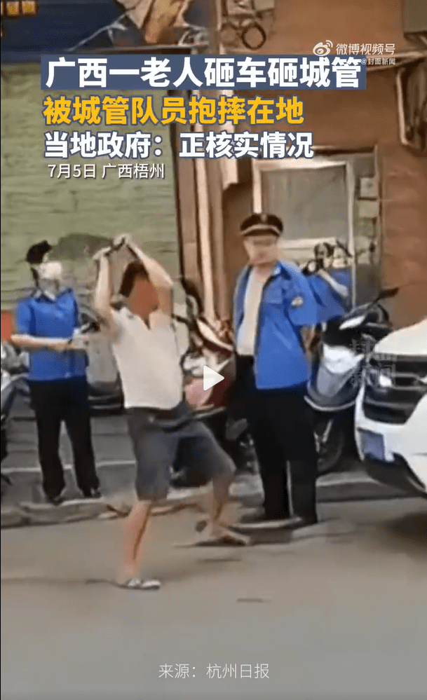 近日,网传广西梧州龙圩一城管队员赤裸上身将一男子抱摔在地,周围多名身着制服的执法人员在拍摄视频,无人上前制止或搀扶,引发热议。