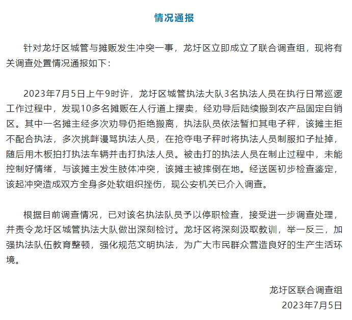 2023年7月5日上午9时许,龙圩区城管执法大队3名执法人员在执行日常巡逻工作过程中,发现10多名摊贩在人行道上摆卖,经劝导后陆续搬到农产品固定自销区。其中一名摊主经多次劝导仍拒绝搬离,执法队员依法暂扣其电子秤,该摊主拒不配合执法,多次挑衅谩骂执法人员,在抢夺电子秤时将执法人员制服扣子扯掉,随后用木板拍打执法车辆并击打执法人员。被击打的执法人员在制止过程中,未能控制好情绪,与该摊主发生肢体冲突,该摊主被摔倒在地。经送医初步检查鉴定,该起冲突造成双方全身多处软组织挫伤,现公安机关已介入调查。根据目前调查情况,已对该名执法队员予以停职检查,接受进一步调查处理。