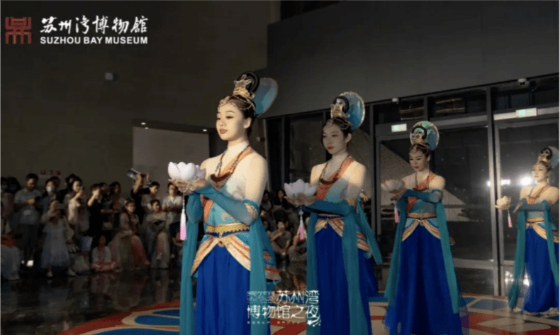 6月10日,飞天舞者以一曲云冈乐舞开启了一场跨时空的文化盛宴——穿越时空的宝藏·苏州湾博物馆之夜。当晚,300多名观众身着古风服饰,领略历史文物、文化遗产之美。各展厅内,雕版印刷、江南传统织机、江南丝竹音乐等体验活动,让观众沉浸其中。