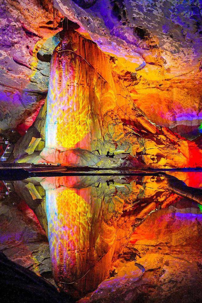 乘坐云梯便可以到达山顶被誉为“亚太第一大洞厅”的九霄碧云洞。2.8万平方米的天然的溶洞奇观,温度可低至17℃。行走其间,水影绰约,五彩的灯光游动在石壁之上,堪称溶洞版的茶卡盐湖。