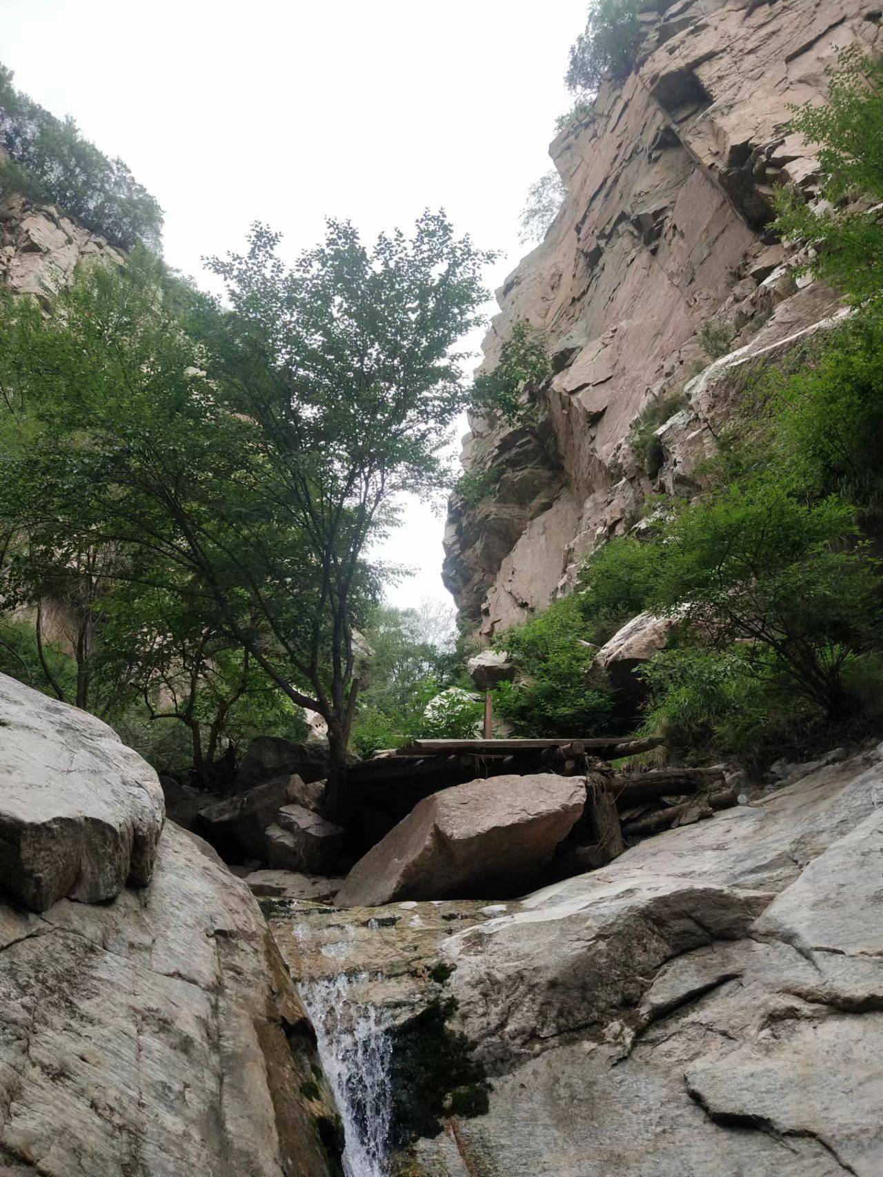 在一条弯曲的小道指引下,众人登上了第一道瀑布的崖顶。不止一次来过蝴蝶谷的徐亮老师,对这里的一切如数家珍。古人尚懂接通天地,老徐对此感悟颇深,每次出谷,都有种新鲜的认知,自觉在教学管理上能独辟蹊径,触类旁通。大道似水,至柔至顺,做人一样谦卑随和。很难想象一个人没有一定修为,是断然做不到的。老徐做到了,因材施教,耐心之至,今年代县教育触底反弹,高考出类拔萃,老徐最感欣慰。人生都要经历谷底,关键要坚定信念,有逆流而上的勇气。很难想像落差不大的溪流,虽没有水雾弥天、龙吟虎啸之壶口瀑布的气势,却也有一段浪漫又残酷的跌宕。关于蝴蝶谷的传说没有谁比历史老人知道的更多,它秀外慧中,天然雕饰,凄美动人,悲壮豪迈,这些传说不论是来自民间还是史书,不论是真实还是虚构,都说明了当下人们对美好事物的向往。这里泉多,百水交汇,若遇天旱,细如流苏,银珠飞溅,脆如响铃,温柔可融,实在让人痴迷。看,知性的小贾,一头黑发简单扎个低马尾,从不计较,却脚底不小心绊了一下,清凉的泉水很快善解人意地打湿了她的鞋袜,水利万物而不争,谁知小贾比打旋的溪水还笑的欢。大德不孤,众行至远,一旁游客莫名的乐着偷偷拍下镜头。坐在这一片青翠欲滴的的松林下,众人感觉呼吸似乎平稳了许多,体能迅速得到补充。闭上眼,沁入肺腑的森林气息在周围弥漫,风与花木的对话清晰可闻。忽而,不知从前方什么地方,传来了几声鸟鸣的叫声。我们抬头循声望去,原来有青年在模仿鸟叫,故意吸引异性。在这祥和、宁静的自由之地,巉岩、草丛、蓝天、心情,一切都是那么美好。但我总觉着这样的场景中,似乎还少一点什么。恍惚间,几个少女模样的学生头戴遮阳小帽,叽叽喳喳,佩带唱机,浅笑凝眸,笑声银铃,勾勒出另一幅生动画面:我酿的酒喝不醉我自己,你唱的歌却让我一醉不起……