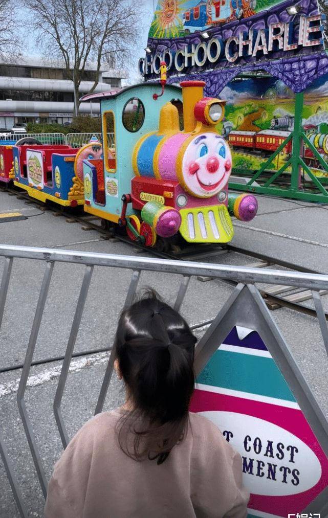 另外一天她又带着女儿去游乐场玩耍,这次她也是晒出女儿的背影,女儿看着这卡通版的火车也是看得很入迷,相信也是很想玩。