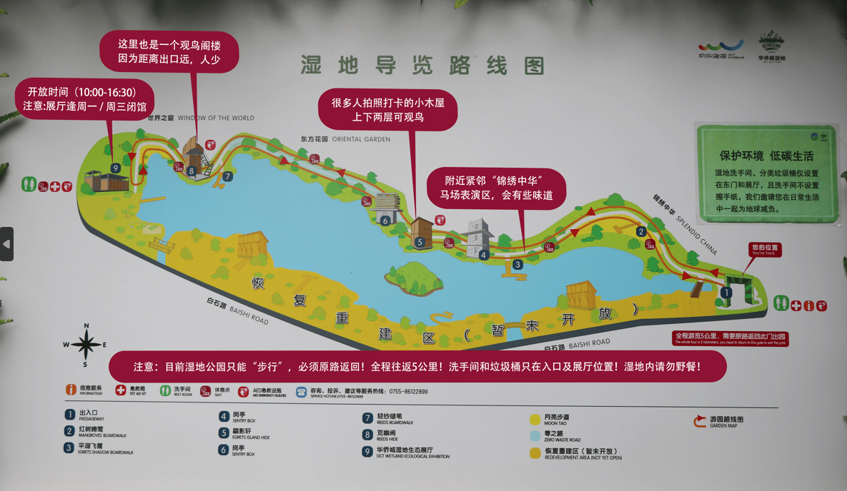 3.华侨城湿地展厅的开放时间是10:00-16:30,周一/周三会闭馆,如果是下午才入园,你可以先去展厅,再慢慢走回来;