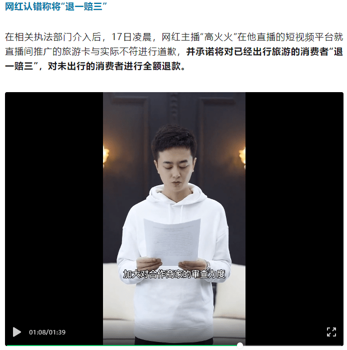 最近,某短视频平台主播“高火火”在直播间售卖了一款单价299元的旅游卡,声称是“6天5晚云南双人游,高端纯玩团,全程无购物,豪车接送,上100万保险”。有网友称,自己购买了这款旅游卡后在参团游玩过程中发现,完全不是直播间所宣传的那样,实际上是单纯的购物团,并且要求从早到晚购物,存在涉嫌虚假宣传欺骗消费者。对此,云南省旅游执法总队表示,这“属于诈骗,也是在贱卖云南。”他们已向市场监管部门通报此事。