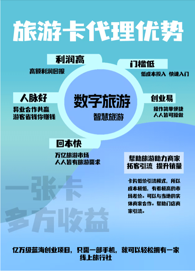 总结起来,旅游卡代理是一种合法的商业行为,只要代理商遵守旅游卡公司的规定和流程,就可以轻松赚取利润。旅游卡代理加盟可以赚钱,但是具体赚钱多少取决于代理商的努力和营销策略。旅游卡加盟并不是骗局,而是一种合法的商业行为。当然,市场没有想象中的那么纯粹,一旦有巨大的市场前景的时候,就会有一些想要“另辟蹊径”的人走捷径,所以这个时候,不论我们是选择旅游卡出行,还是选择旅游卡代理创造收益,都需要慎之又慎,不能因为一时的利益而断送未来的路程。