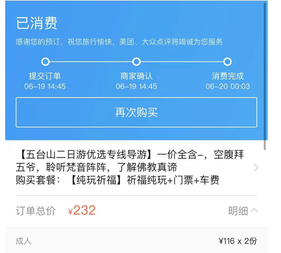 那么,这里面的学问就多了,116元连最起码的五台山入山门票都不够,怎么带团?是入山门票减免还是不花一分钱的门票?如果是正常购票的话,旅行社首先就亏大了。如果门票没有存在暗箱操作的话第二个疑问又来了,旅行社联合商家共同欺骗游客进行忽悠高消费,一辆大巴50人计算,每人被高价卖开光物品,借烧香祈福之名敛财5000元,50人就是25万元,这个利益链能不发财吗?这样就不能理解,在利益面前,尽管有多名游客反映,最后就是退款了事罢了,难以杜绝或敢于公开这么敛财的背后究竟有没有保护伞?应该查查了!