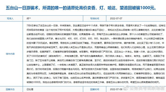 通过五台山网站咨询投诉栏目看到,一游客反映五台山一日游骗术,所谓的唯一的请愿处高价卖香、灯、哈达,望追回被骗1000元。该游客投诉称“这些的商人利用游客的诚心,打着菩萨的慈悲心,施展他们的黑心,泯灭了做人的良心,玷污了佛门圣地,也给五台山名声抹黑。真切希望有关部门严厉打击,多做宣传工作,提高游客防范意识,替我追回被骗的1000元。”写信时间显示2022-07-07日,回复状态显示已处理。同样在2022年6月18日游客反映被五台山导游和商家欺骗游客买高价香火。
