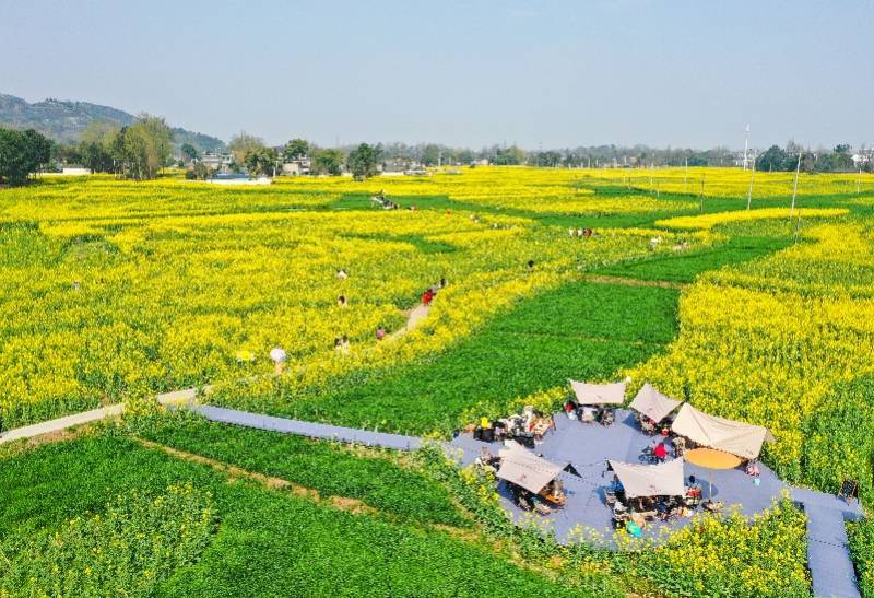 3月5日,在四川省崇州市道明镇,游客在油菜花田中观光休闲(无人机照片)。新华社发