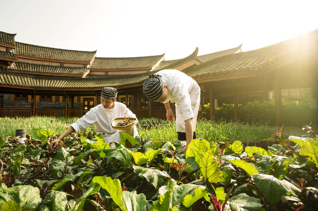 其次是占地181亩,绿植覆盖面达80%,走在任何一个角落都能看到叫得上或不认识的大树、银杏、鸢尾、龟背竹、梨树、桃树、樱桃李子等等。绿色农场里有水稻、番茄、豆角、青瓜、桑叶、黄精、紫苏……所有新闻稿上提及的内容并非堆砌,可持续发展的概念在这个品牌身体力行地输出,有自己的绿色农场,让蔬菜瓜果直达餐桌,有自己的堆肥站,让整个循环有闭环。六善始终坚持着农场直达餐桌的理念,酒店运营的绿色农场为各个厨房提供新鲜鸡蛋、蔬菜和水果,并为六善水疗中心提供草药原材料。散养的家禽每天产下新鲜鸡蛋。新鲜的水果采摘发酵制作成健康特色的“火箭燃料”。天然的、本地的、少即是多以及可持续的原则让食材的挑选用心、放心,人们能在这里品尝到食材的原生味道,用味蕾触摸大自然的本味,由内至外,重拾内心充盈。