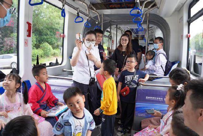 体验换乘无忧,学习智轨知识。接着,智轨工作人员带领大家从9号口出站至马路中间的站台换乘智轨电车,在车厢内我们的客运员小姐姐以趣味讲解、有奖问答和答疑解惑的方式与大家进行了互动,宣传普及了智轨的相关知识。车厢内欢声笑语、热闹非凡,大面积通透的玻璃窗让车厢看起来宽敞明亮,丝毫不影响乘客领略车窗外的一路繁花盛景。