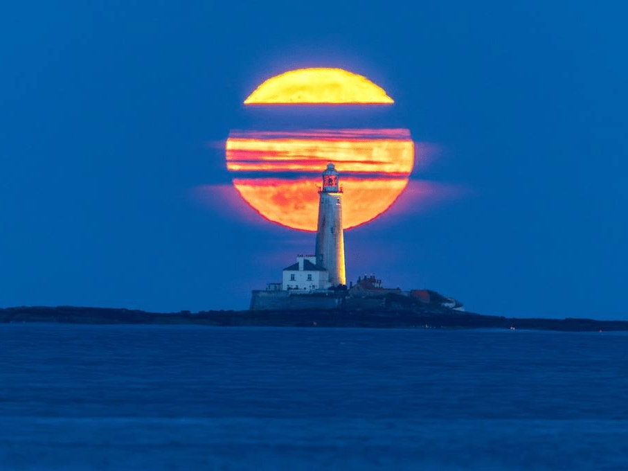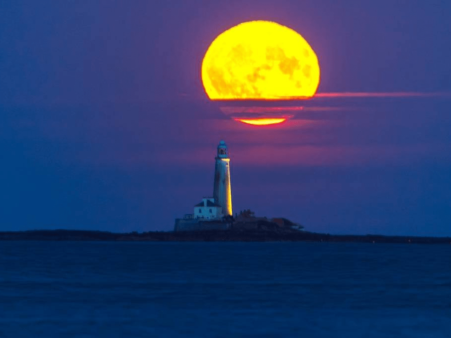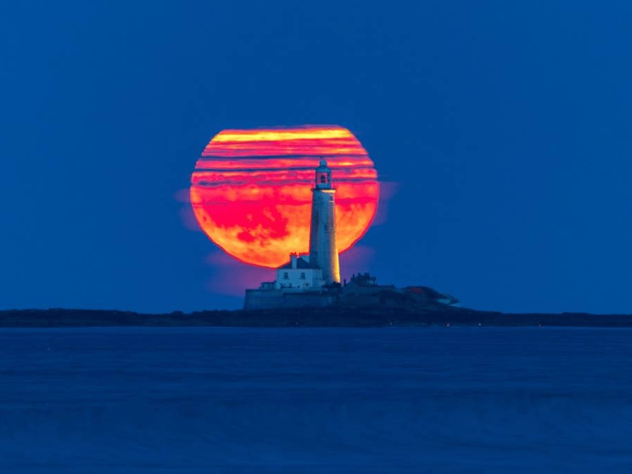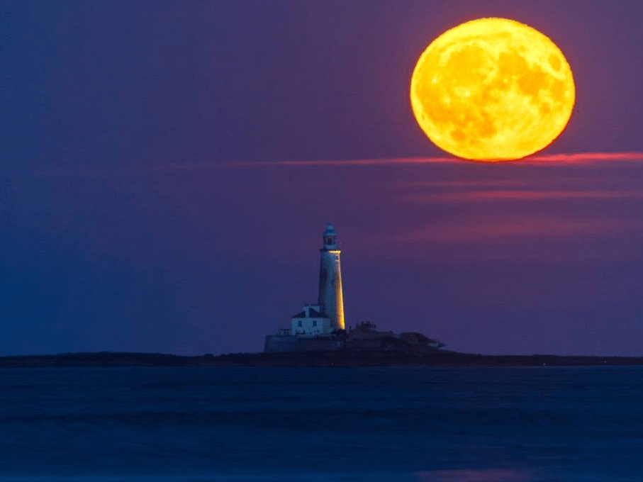 英国惠特利湾,雄鹿月从惠特利湾的圣玛丽灯塔上升起。