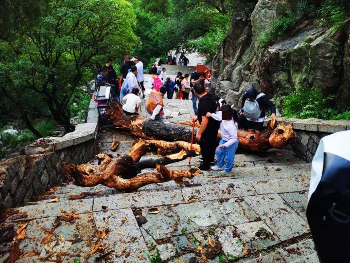 7月4日,山东泰山风景区内一棵枯木的树干从人行阶梯上滚落,砸到路过的游客,引发关注。