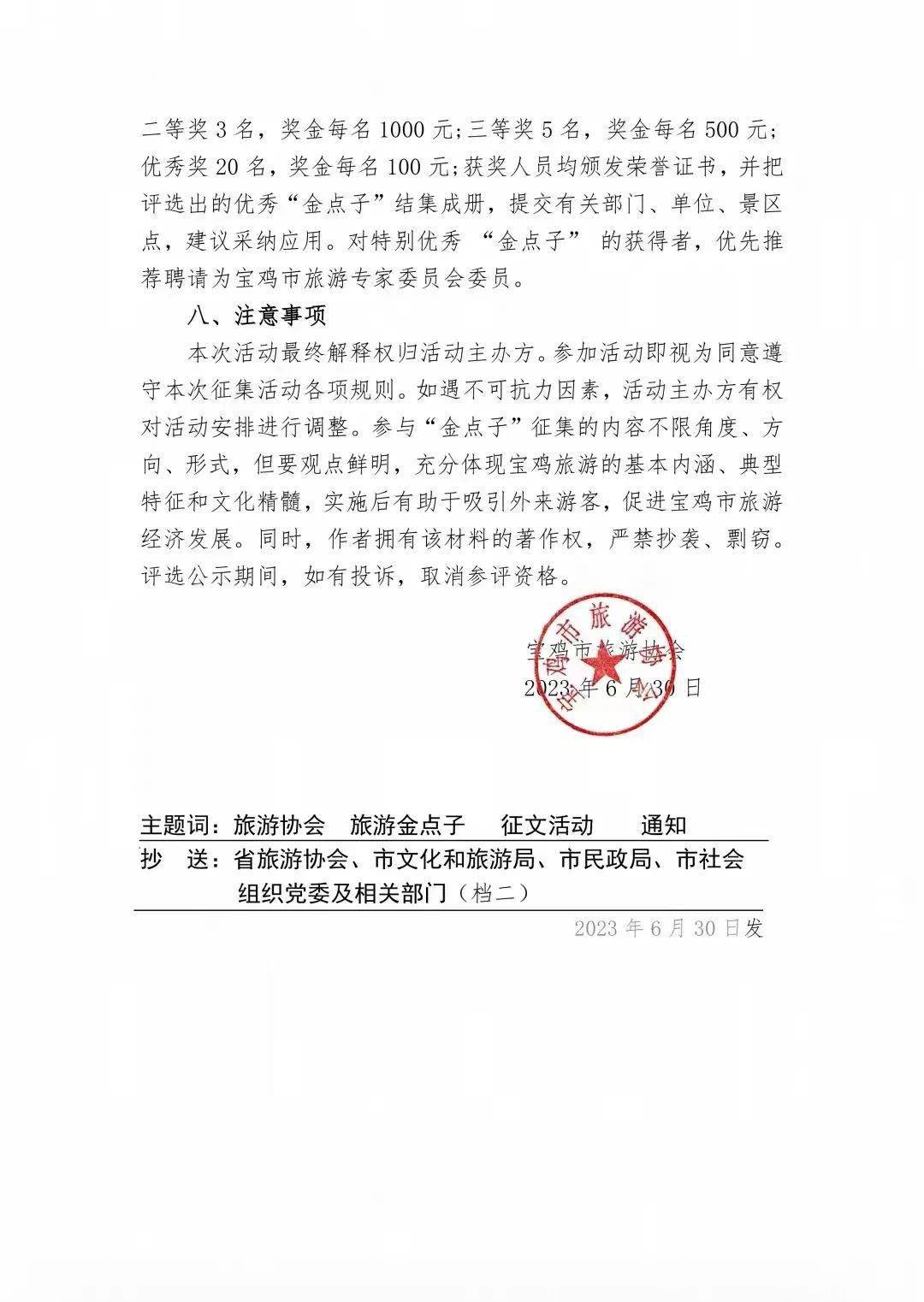 本次活动最终解释权归活动主办方。参加活动即视为同意遵守本次征集活动各项规则。如遇不可抗力因素,活动主办方有权对活动安排进行调整。参与“金点子”征集的内容不限角度、方向、形式,但要观点鲜明,充分体现宝鸡旅游的基本内涵、典型特征和文化精髓,实施后有助于吸引外来游客,促进宝鸡市旅游经济发展。同时,作者拥有该材料的著作权,严禁抄袭、剽窃。评选公示期间,如有投诉,取消参评资格。