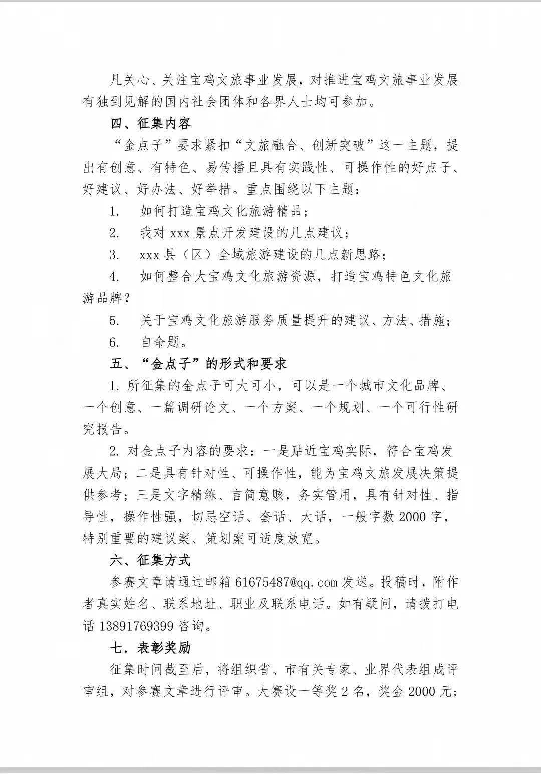 2 .对金点子内容的要求:一是贴近宝鸡实际,符合宝鸡发展大局;二是具有针对性、可操作性,能为宝鸡文旅发展决策提供参考;三是文字精练、言简意赅,务实管用,具有针对性、指导性,操作性强,切忌空话、套话、大话,一般字数2000字,特别重要的建议案、策划案可适度放宽。