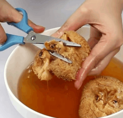2、给猴头菇修剪根蒂部。泡好后,用剪刀把猴头菇的根蒂部分剪掉,然后撕成一块块并捏干水分。