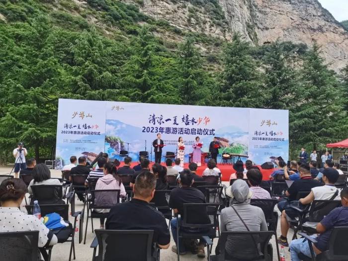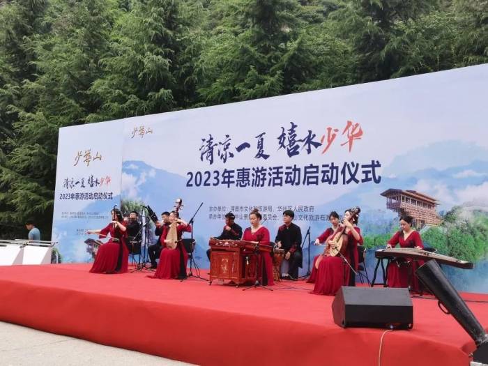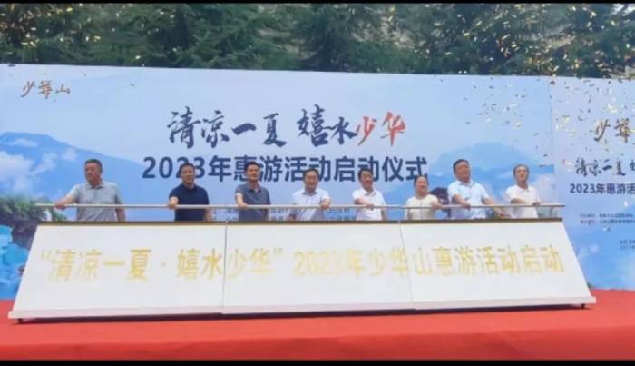 活动在陕西民族乐团的演奏曲 《我的中国心》中拉开序幕, 诗朗诵《少华赋》等节目表演 让现场气氛热烈。随后, 与会领导共同启动 2023年清凉一夏·嬉水少华惠游活动, 少华山景区作了专场推介。