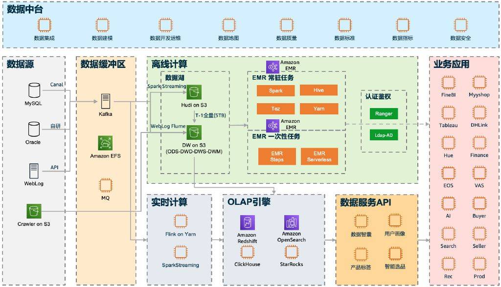 为了实现大数据战略,敦煌网通过前期调研,对离线集群、数据仓库引擎、对象存储等进行多个维度、多家厂商及开源方案深入评估测试后,最终选择亚马逊云科技为其建设大数据云技术底座。选择亚马逊云科技的原因有两点:第一、亚马逊云科技生于零售,拥有强大的电商创新经验,与敦煌网的业务模式非常契合,为电商行业专门构建的产品和服务经过自身多年检验,从架构兼容性、算力、维护成本、开放性、扩展性等角度都能够很好满足敦煌网的需求。此外,安全合规已成为各国政府持续监管重点,亚马逊云科技满足全球范围内严苛的合规标准,能够有效保障敦煌网全球范围的数据安全和隐私保护。