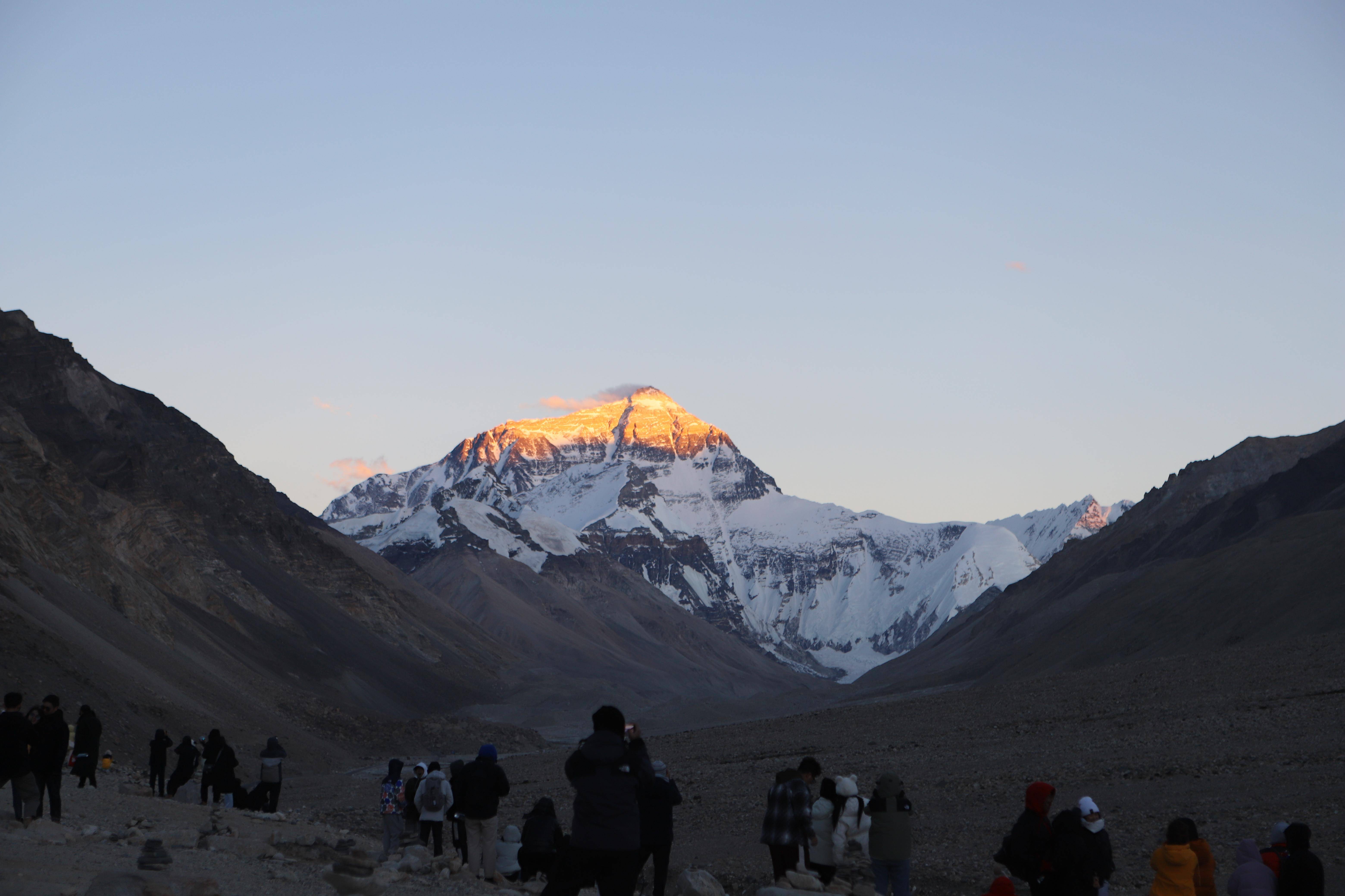 6月下旬,记者在珠峰景区看到,环保大巴接连不断地向珠峰大本营运送着游客,珠峰高程测量纪念碑前等待拍照留念的游客排起了长队,游客们手里拿着手机、相机对着雪山猛拍,“日照金山”美景便顷刻收入镜头。