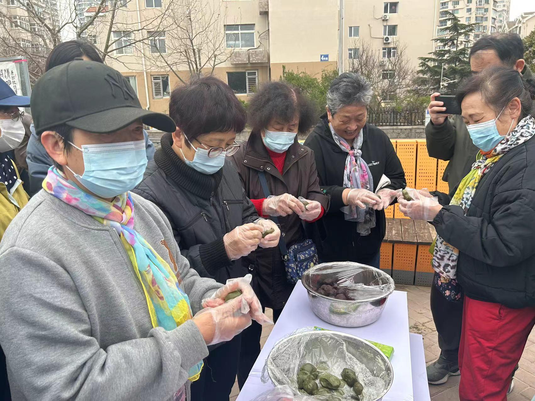 揉面团、加面粉、拌馅料、包团子.....艾叶青团碧绿,散发淡淡的清香和糯香,沁人心脾。一颗青团,藏味春天,参加活动的居民在一片欢声笑语中体验了一把清明节的食俗文化,给舌尖增添一丝时令美味。