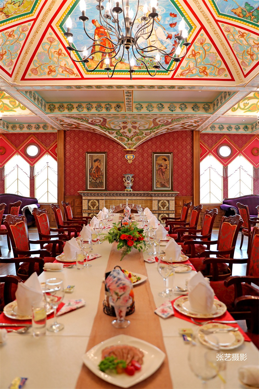 墙上的彩绘是艺人一笔一笔纯手绘上去的,色彩艳丽却不张扬,文艺气息在房间内回档,却又不失典雅,可以让游客一边吃着西餐,一边感受着异国的文化,我想这样的经历该是一种别样的体验吧。